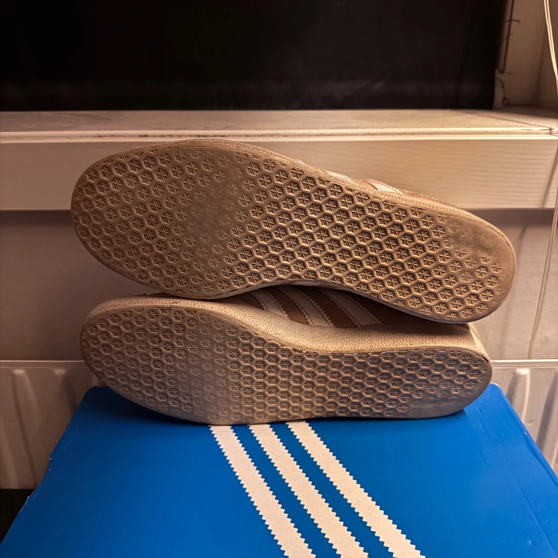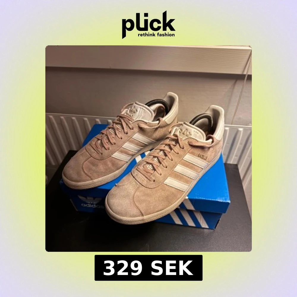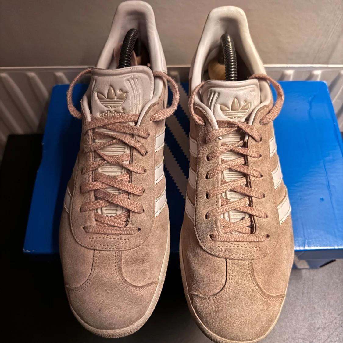Säljer ett par klassiska Adidas Gazelle sneakers i rosa mocka med vita detaljer och de ikoniska tre ränderna på sidan. Skorna har snörning, platt sula och rund tå. Perfekta för dig som gillar stilrena och tidlösa sneakers med retrovibbar.