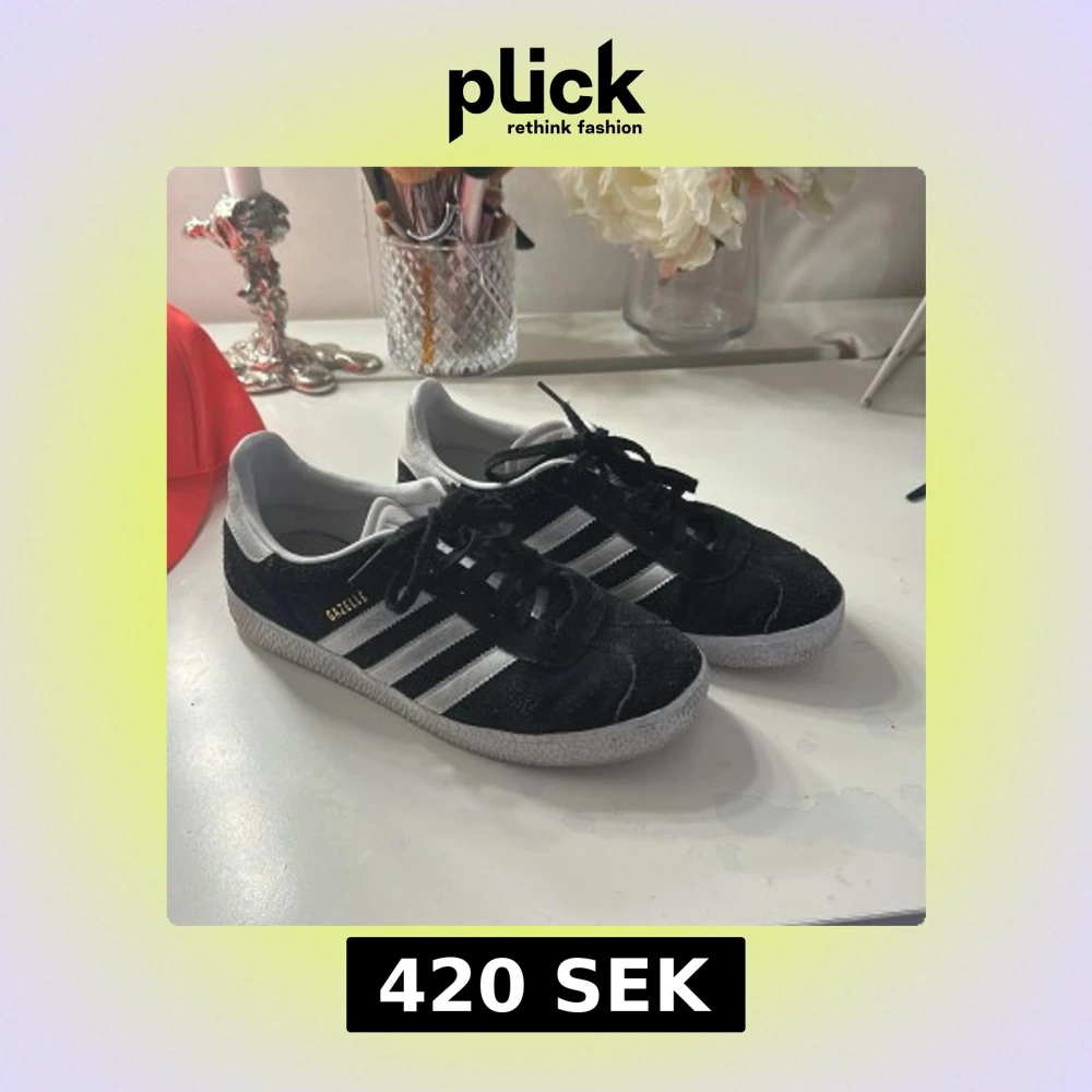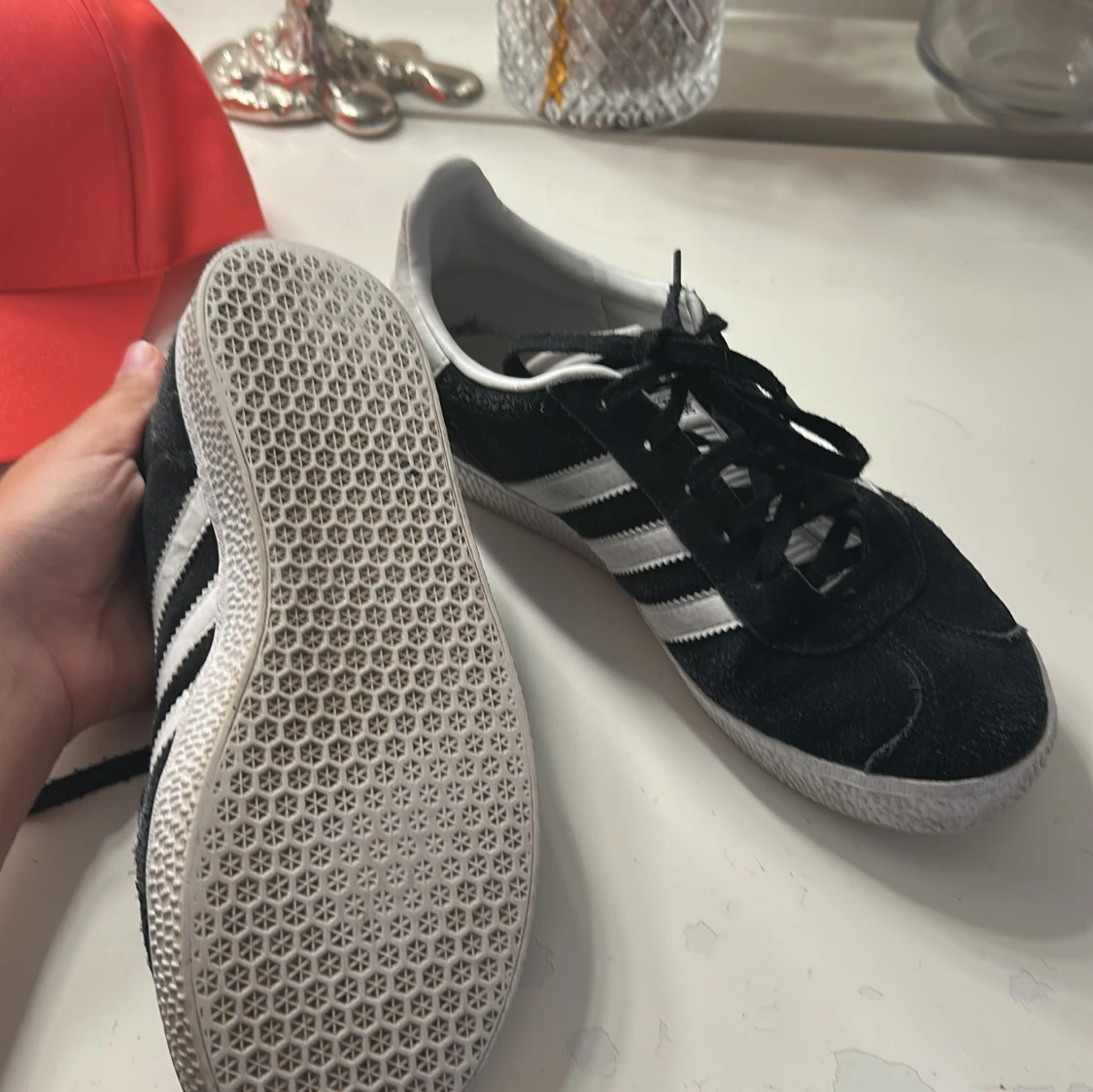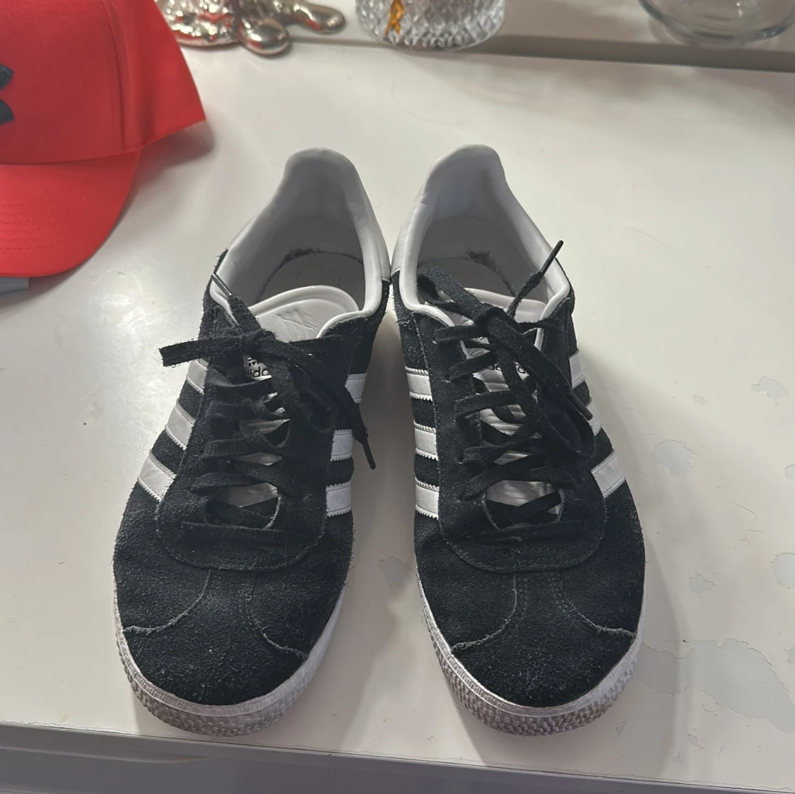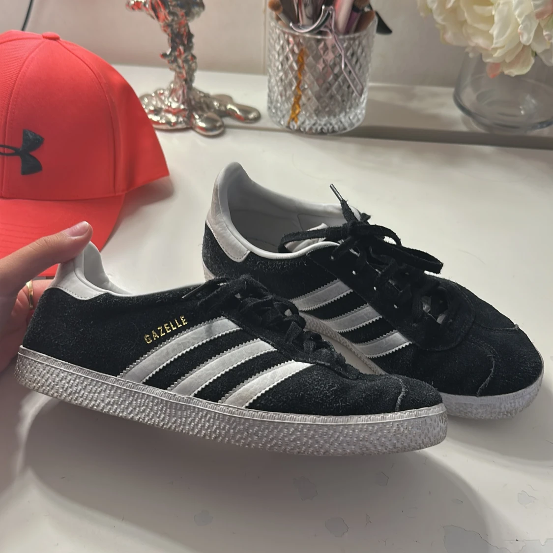 Svarta Adidas Gazelle sneakers i mocka med klassiska vita ränder och vit sula. Skorna har snörning och rund tå, samt diskret guldfärgad Gazelle-text på sidan. Perfekta för en clean och sportig look.