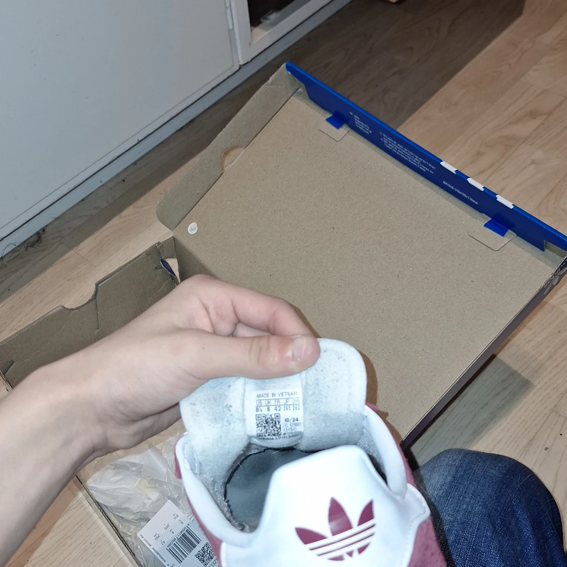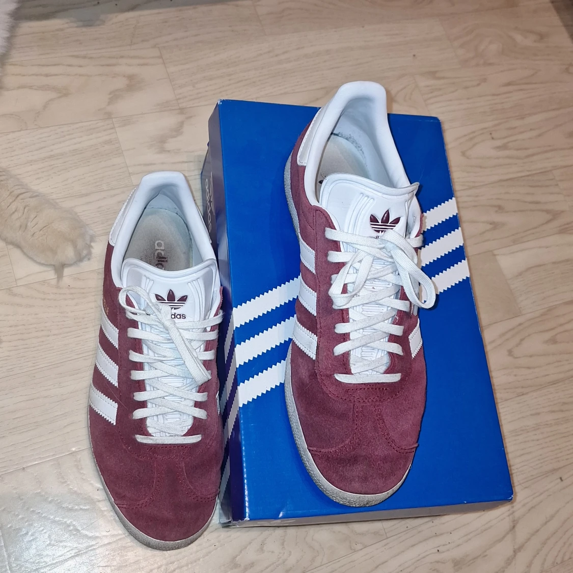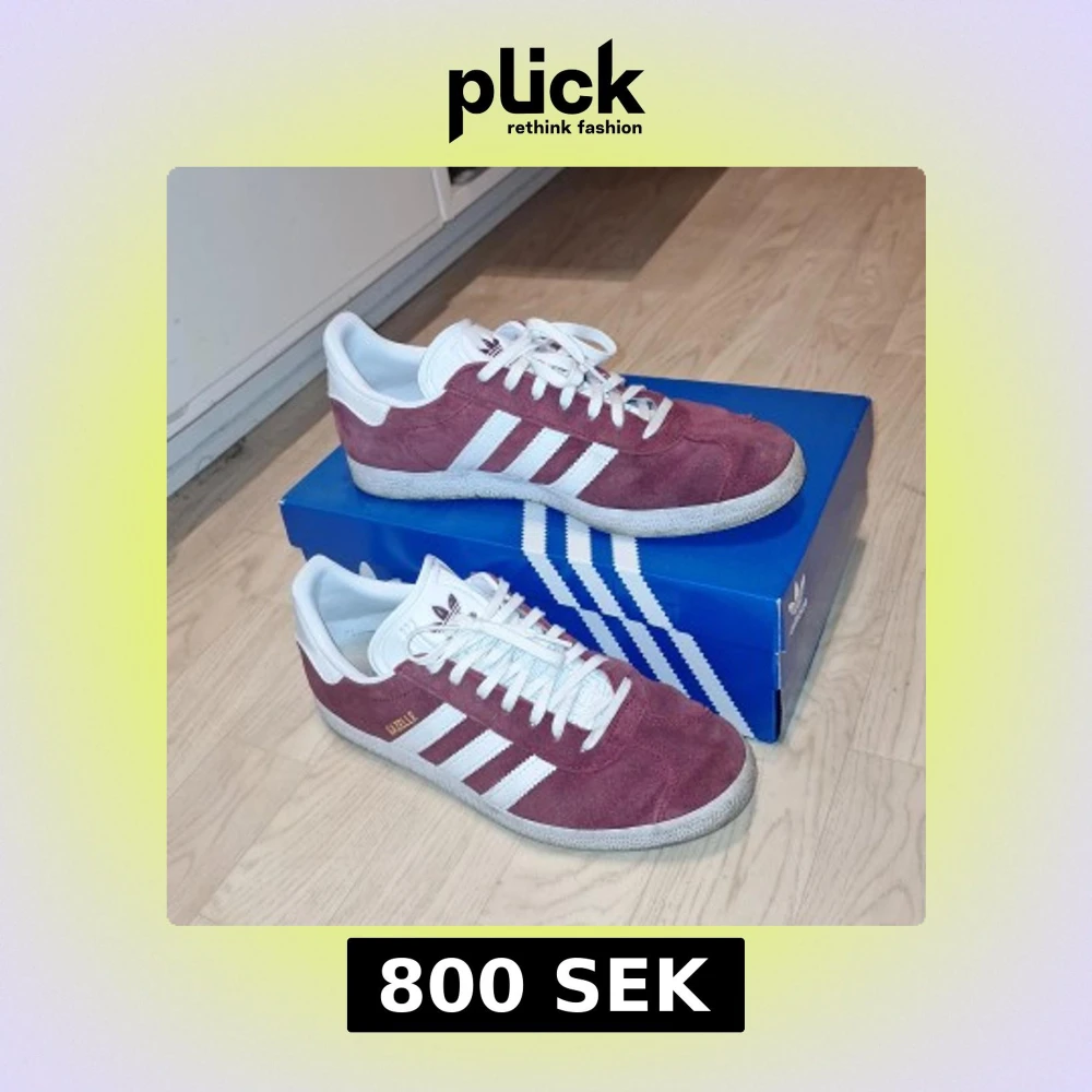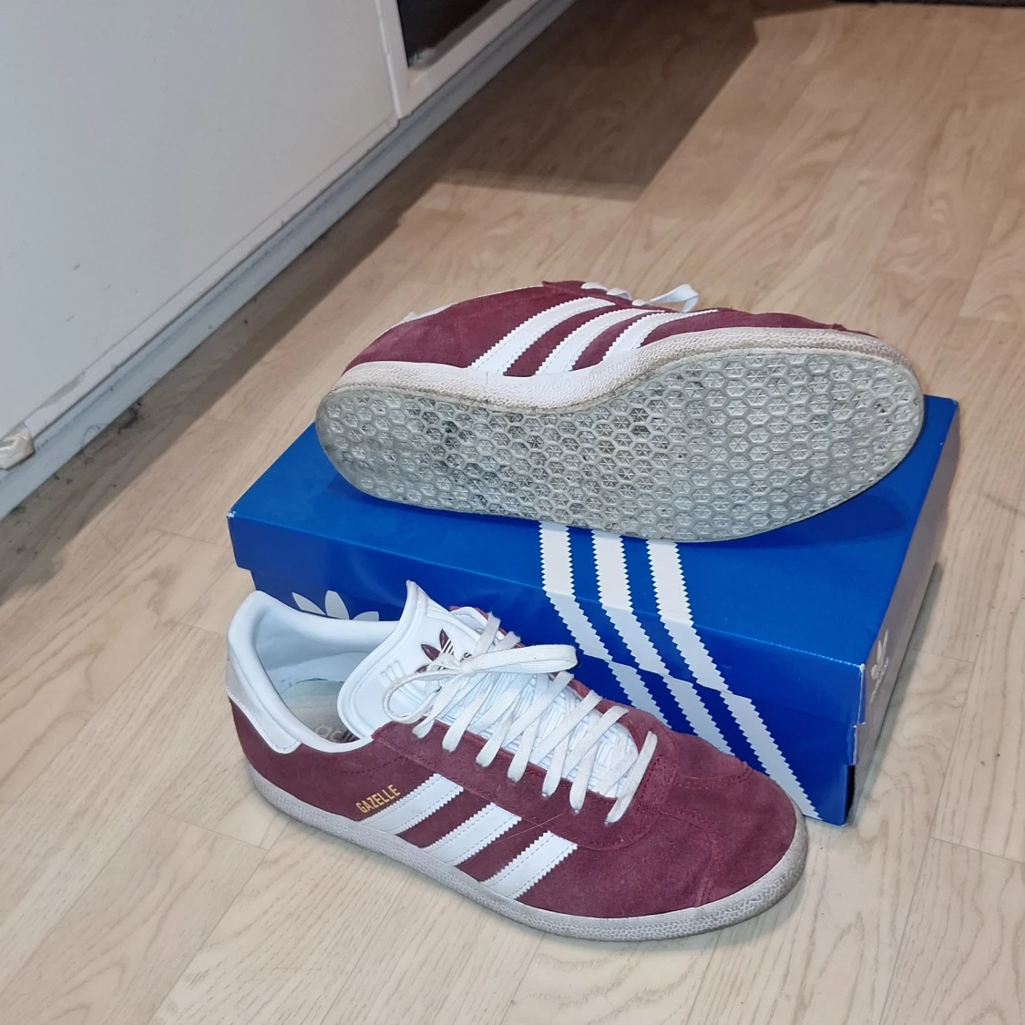 Säljer ett par Adidas Gazelle sneakers i vinrött mocka med vita detaljer och klassiska tre ränder på sidan. Skorna har rund tå, platt sula och snörning. Adidas-logga på plösen och hälpartiet, samt guldfärgad Gazelle-text på sidan. Perfekt för dig som gillar retrostil. Hör av er vid frågor eller funderingar och skicka gärna prisförslag🙌🏼