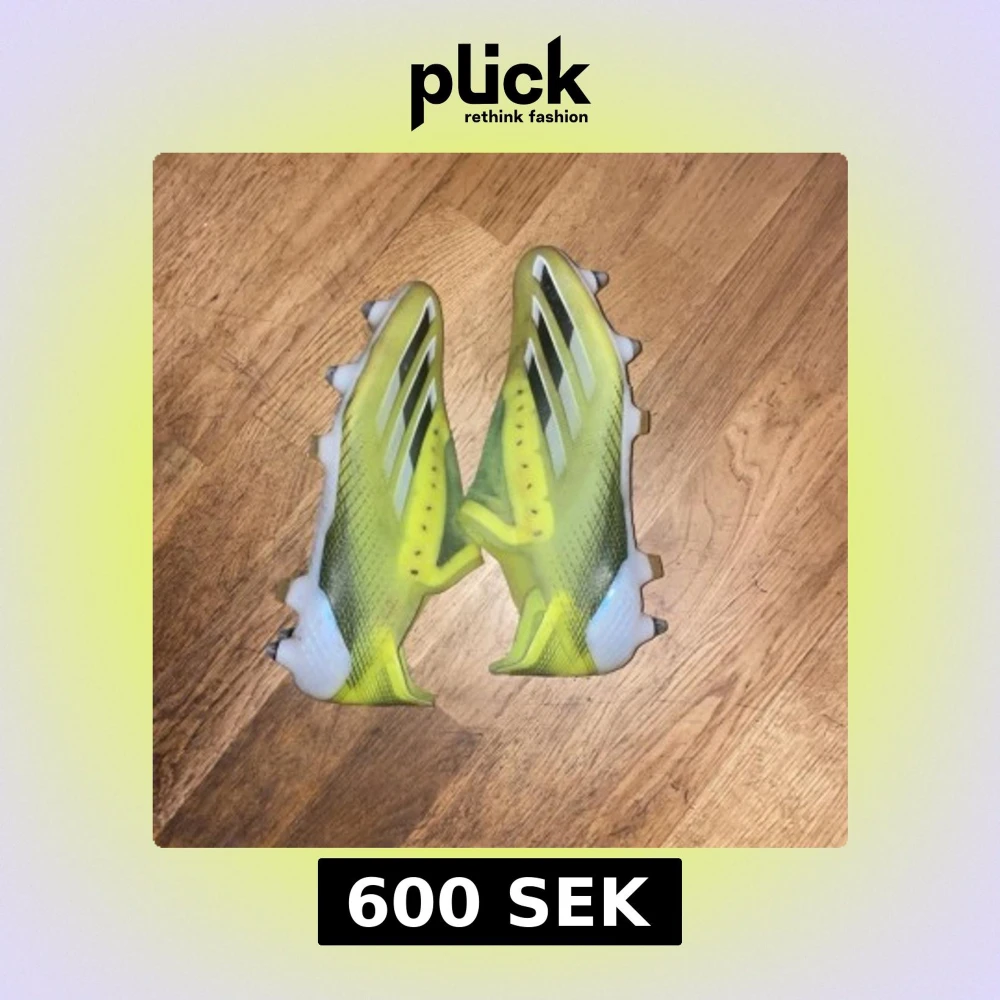 Säljer ett par Adidas fotbollsskor i en cool gul färg med svarta och vita detaljer. Skorna har en strömlinjeformad design, metall- och plastdobbar för gräsplan och de klassiska tre ränderna på sidan. Ovandelen är i syntetmaterial och sulan är vit med svart mönster.