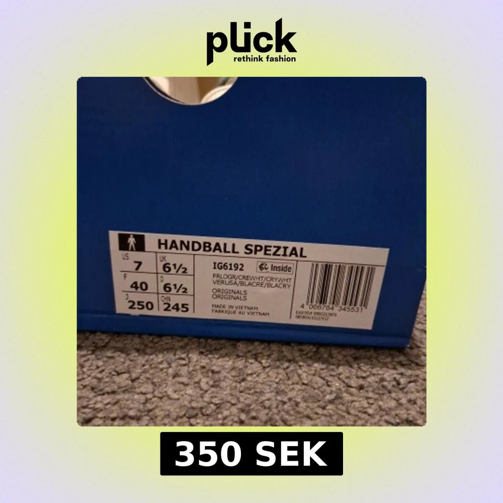 Adidas Handball Spezial sneakers i grön mocka med vita detaljer och klassiska tre ränder på sidan. Skorna har snörning, bruna gummisulor och vit hälkappa. Perfekta för dig som gillar retrostil och vill sticka ut med en unik färg.