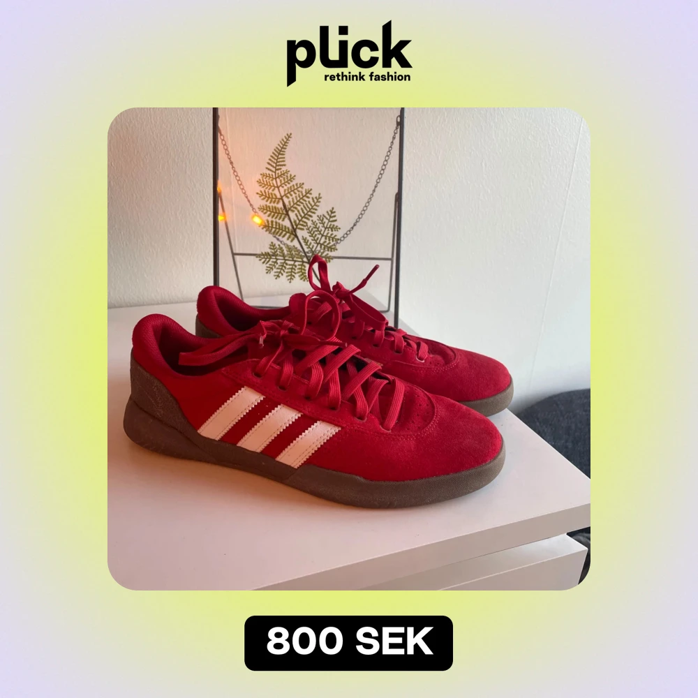 Säljer ett par snygga röda Adidas sneakers i mycket bra skick. De har den klassiska tre-randiga designen i vitt på sidan och är gjorda i mocka. Perfekta för både vardag och fest! Skorna har en bekväm passform och är i storlek herr 41 1/2.
