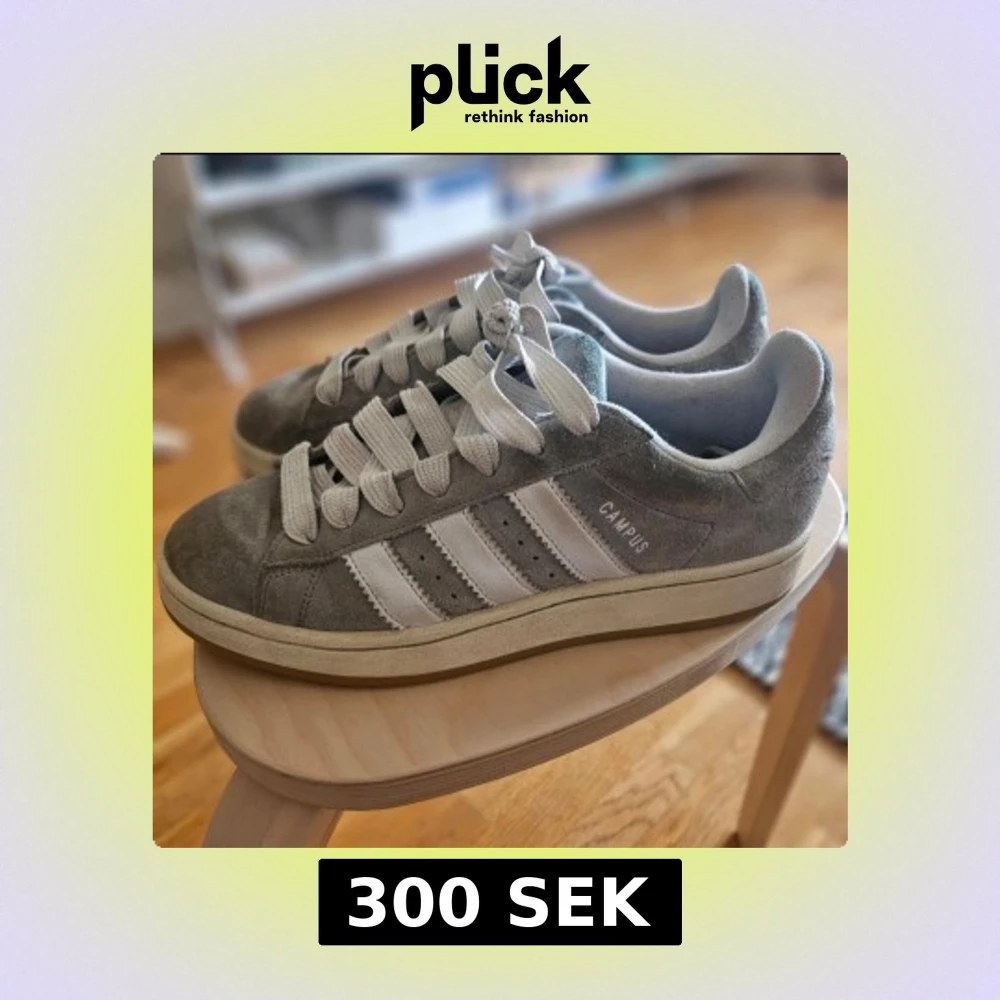 Grå Adidas Campus sneakers med vita ränder och vit sula. Skorna har klassisk snörning och är tillverkade i mocka med textildetaljer. Perfekta för en avslappnad och stilren look.