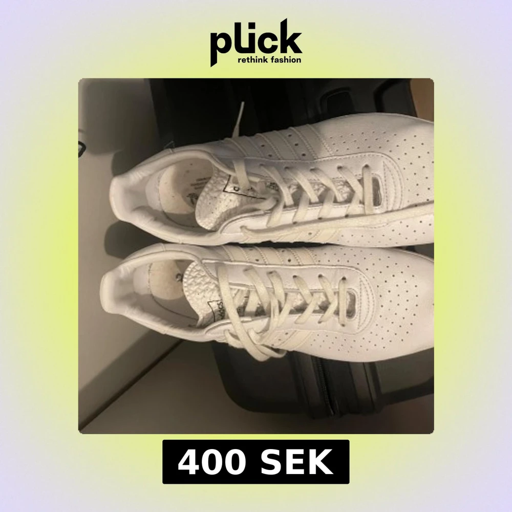 Säljer ett par fräscha vita Adidas sneakers i skinn med klassiska tre ränder på sidan och perforerade detaljer framtill. Skorna har snörning och platt sula, perfekt för en clean och stilren look.