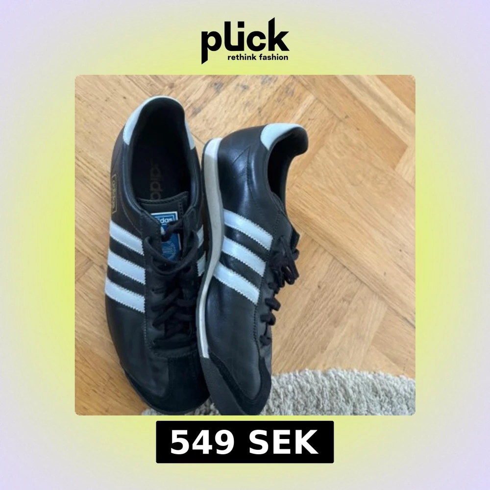 Säljer ett par klassiska Adidas Italia sneakers i svart skinn med vita ränder och detaljer. Skorna har rund tå, snörning och vit sula. Ikonisk retrostil med guldiga Adidas-loggor på sidan.
