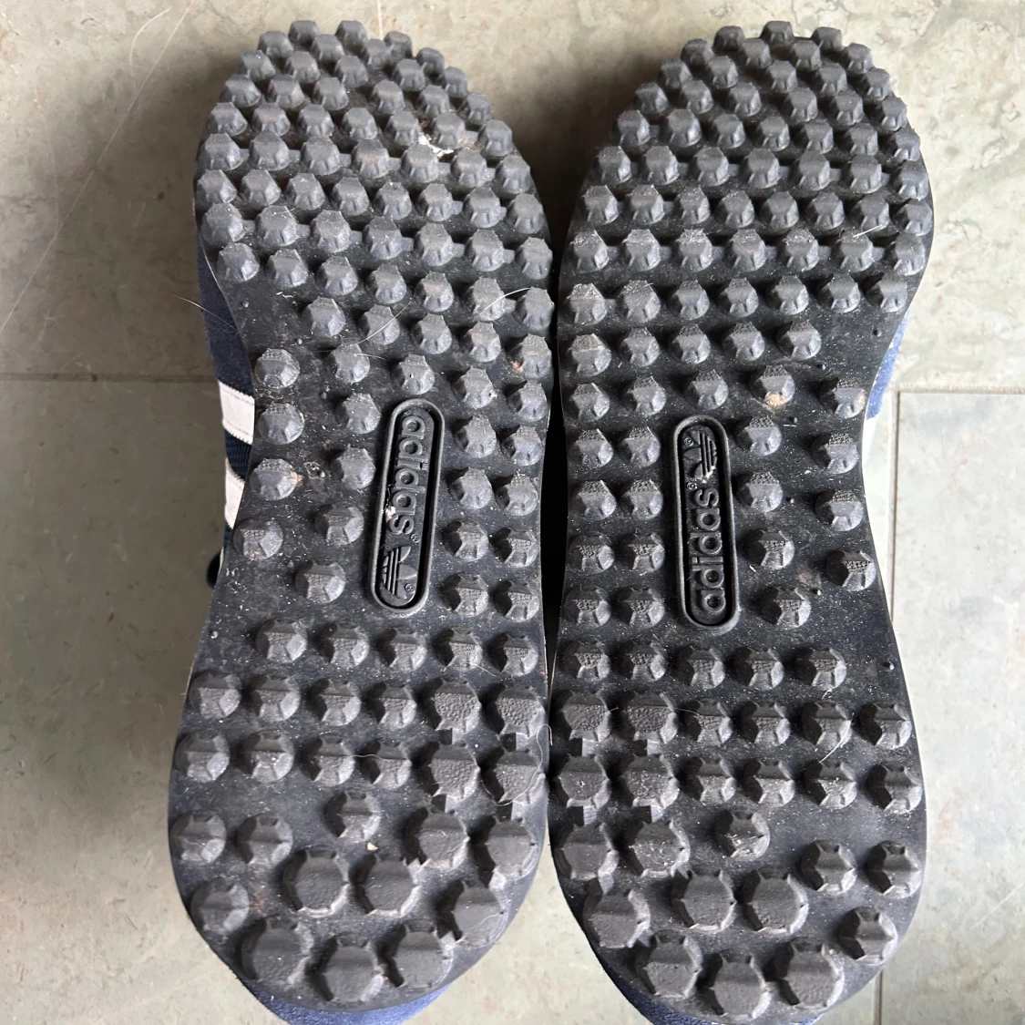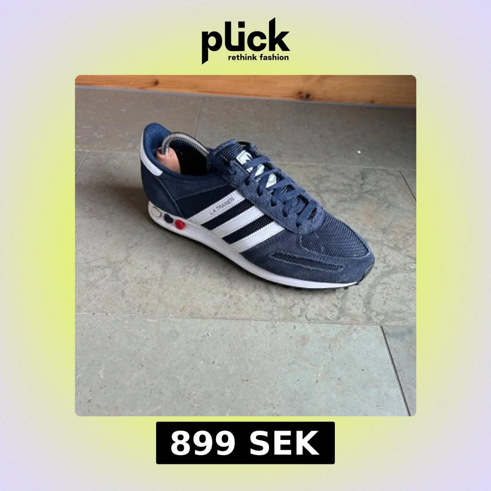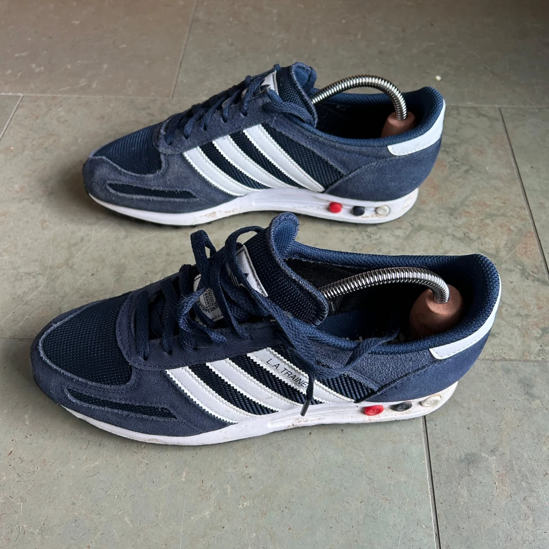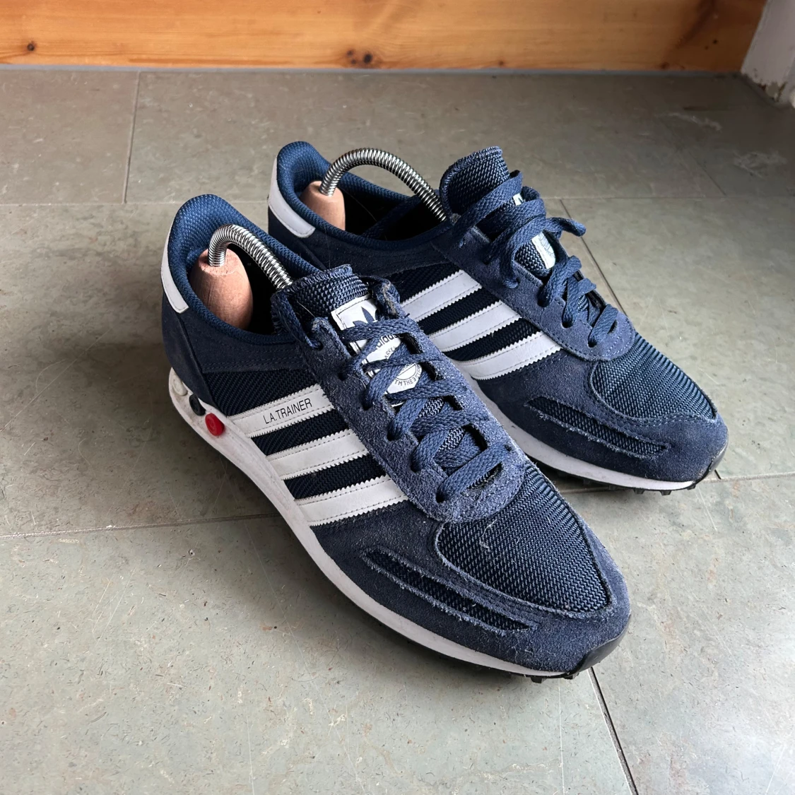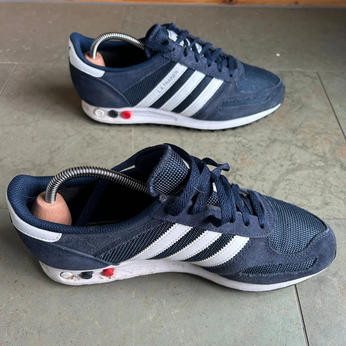 Säljer ett par klassiska Adidas LA Trainer sneakers i marinblått med vita ränder och detaljer. Skorna har snörning, mesh- och mockadetaljer samt en sula med gummidubbar för extra grepp. Perfekta för dig som gillar retrostil och sportig look. Skick 9/10 andvönda 10 gånger skriv vid frågor pris kan diskuteras vid snabb affär