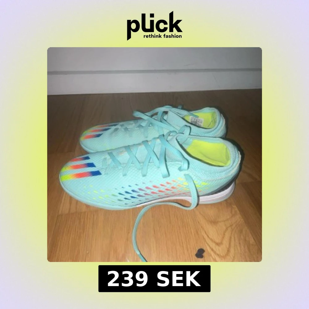 Säljer ett par Adidas fotbollsskor i ljusblått med coola regnbågsfärgade ränder och prickar på ovansidan. Skorna har snörning och en platt sula som passar perfekt för inomhusspel. Insidan är neonfärgad och materialet är syntet för lätt känsla på planen. Använda 3 gånger!!!