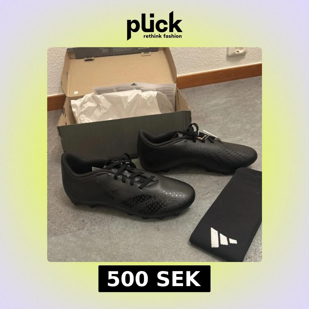 Säljer ett par svarta Adidas Predator Accuracy.4 fotbollsskor med snörning. Skorna har en diskret mönstrad yta och klassisk design med Adidas-logga på sulan. Perfekta för dig som vill ha stilrena och funktionella skor på planen. Helt oanvända och i mycket bra skick