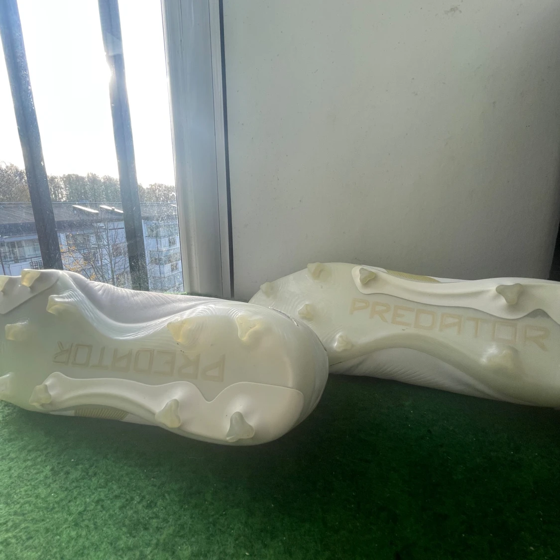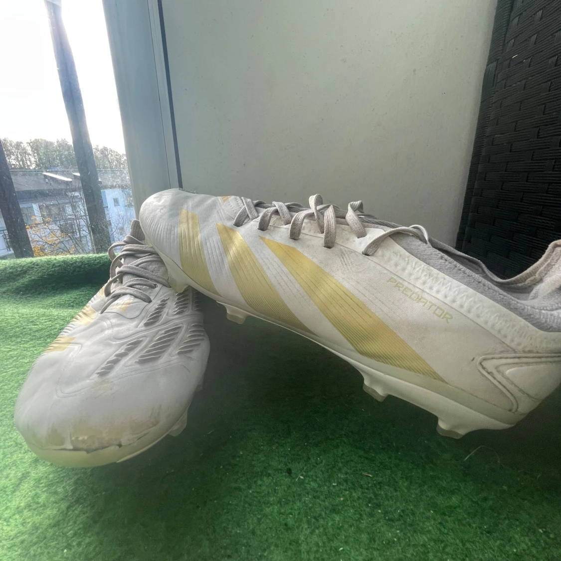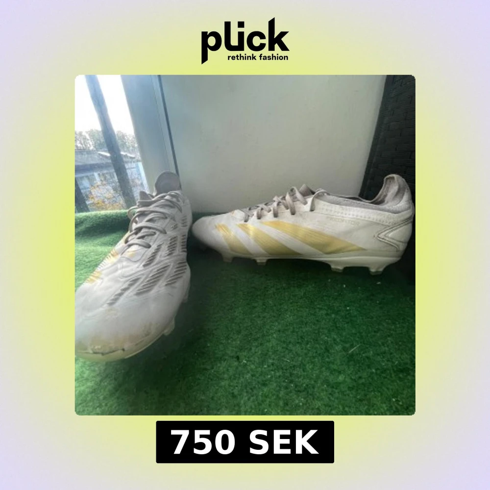 Säljer ett par Adidas Predator fotbollsskor i vitt med guldiga detaljer och klassiska ränder. Skorna har snörning och platt sula med dobbar för gräsplan. Snygg, sportig design med rund tå och mönstrade paneler på ovansidan. Perfekt för dig som vill sticka ut på planen.