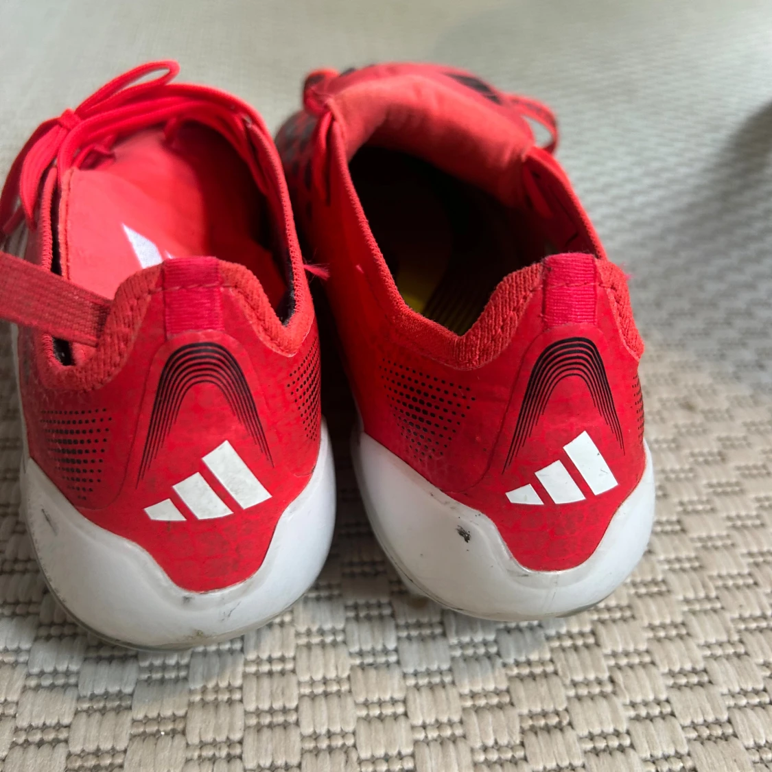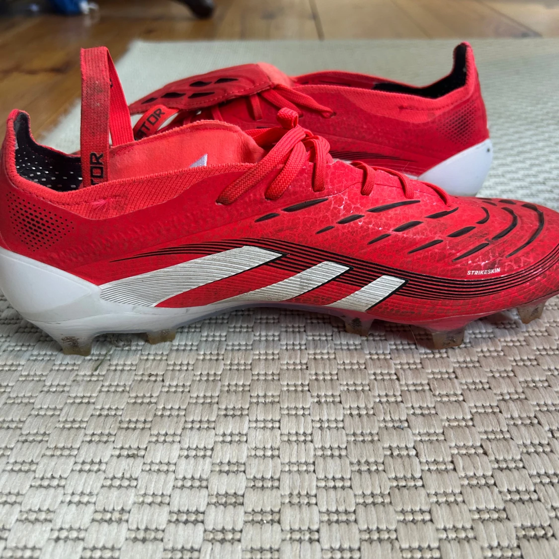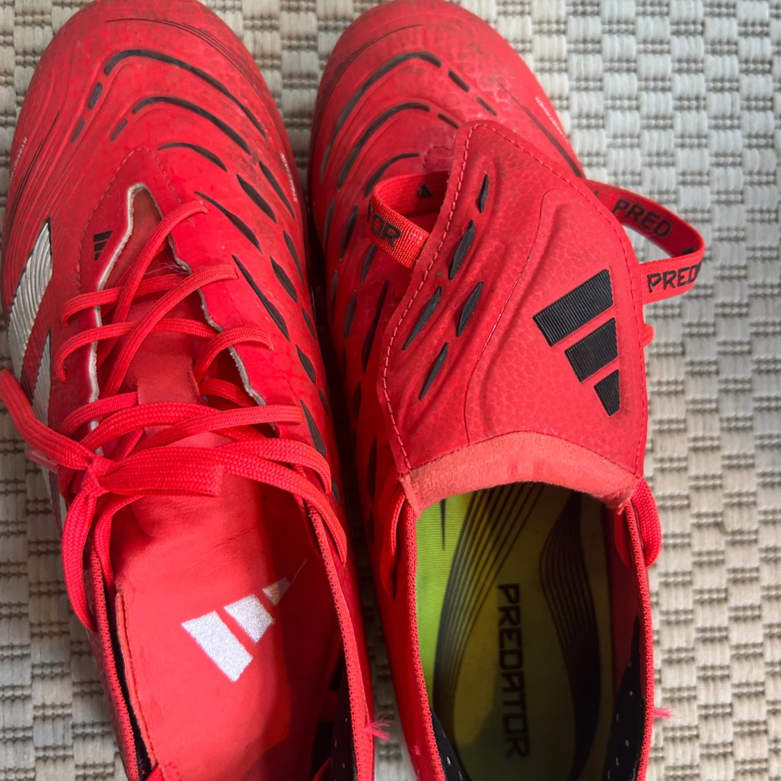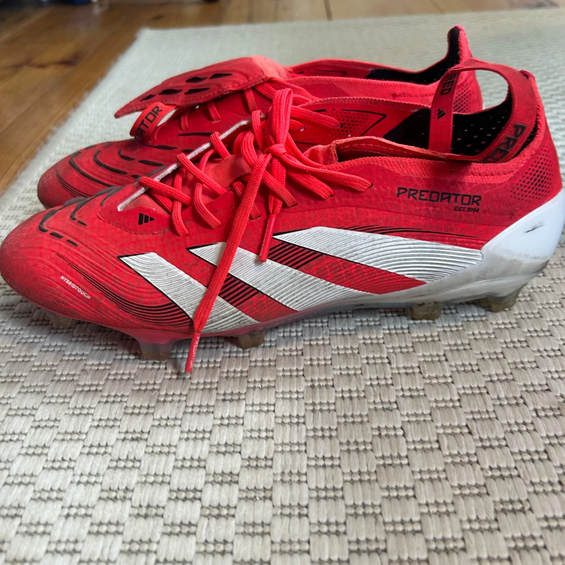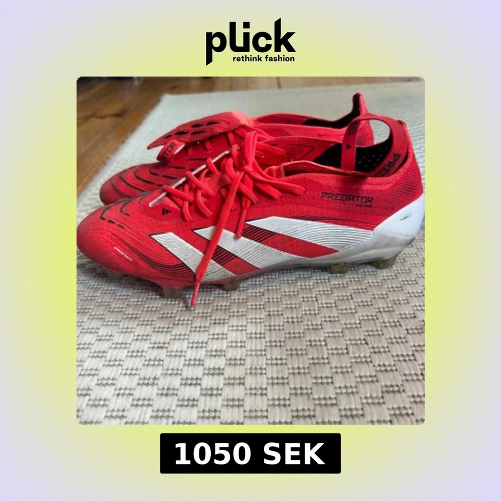 Säljer ett par röda Adidas Predator elite fotbollsskor med vita och svarta detaljer. Skorna har snörning, låg profil och mönstrad ovandel för extra grepp. Snygg design med klassiska tre ränder på sidan och vit häl. Perfekta för dig som vill dominera på planen. Använt dem i 3 månader och nytt pris är 3400 kr.