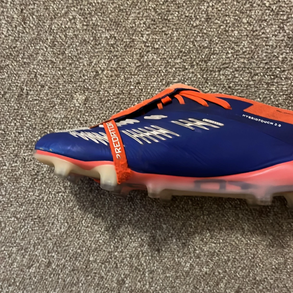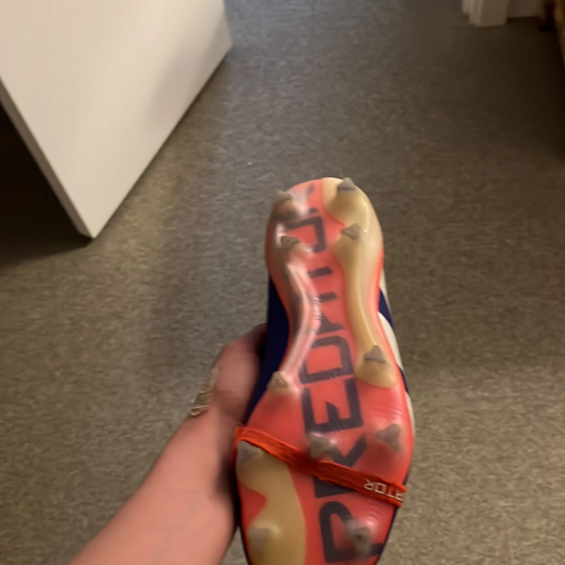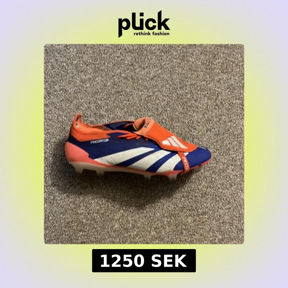 Säljer ett par Adidas Predator fotbollsskor i blått, orange och vitt. Skorna har snörning, täckt plös och tydliga Predator-detaljer. Ovandelen är i syntetmaterial med Hybridtouch 2.0 och dobbar för gräsplan. Perfekta för dig som vill sticka ut på planen. Använt ett par träningar och matcher. Ny pris 3000.
