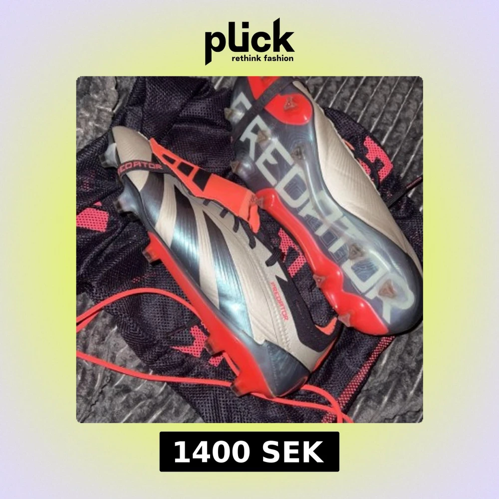 Säljer ett par Adidas Predator fotbollsskor i svart, silver och röd. Skorna har en modern design med röda detaljer och svart snörning. Perfekta för dig som vill sticka ut på planen. Säljes med tillhörande svart och röd påse.