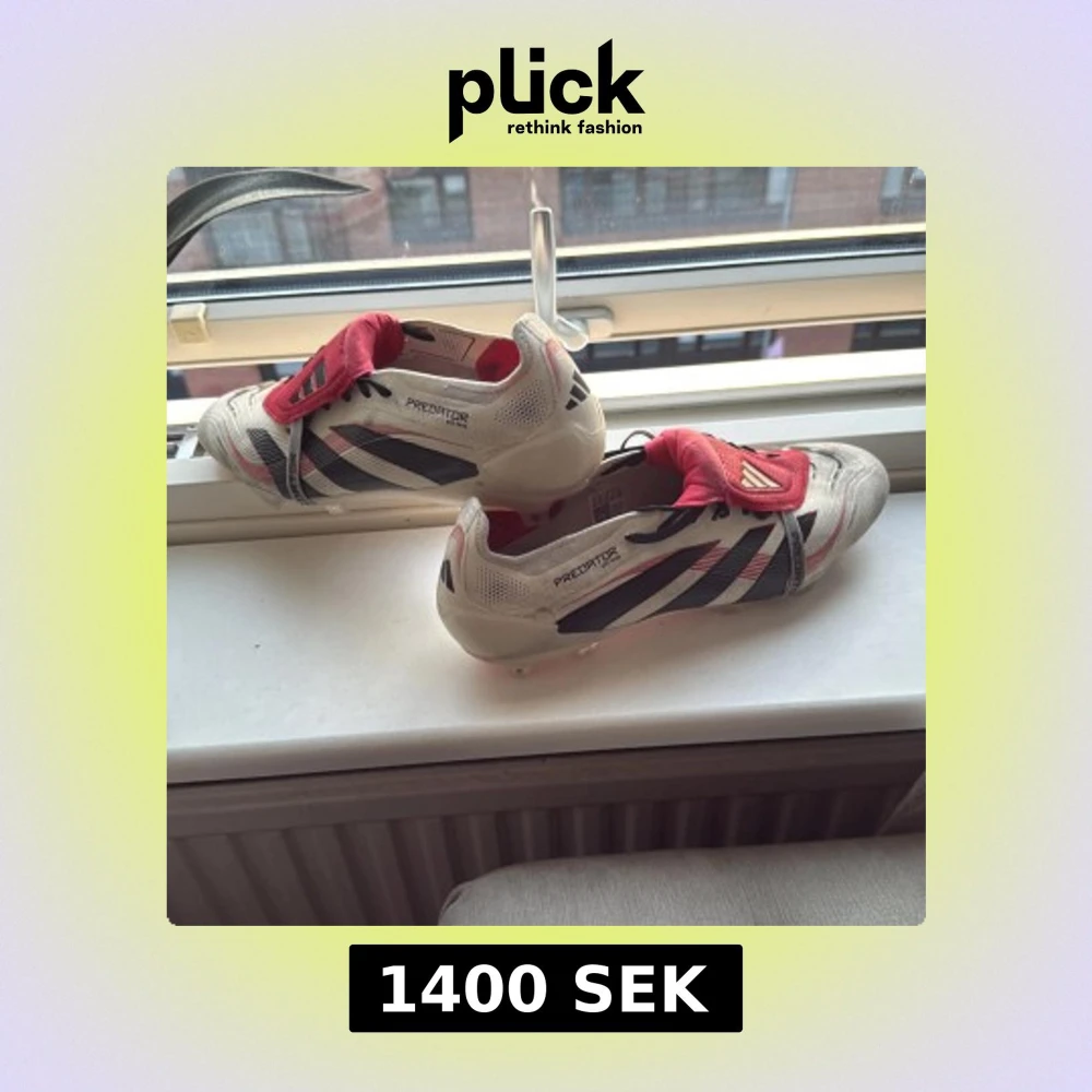 Säljer ett par Adidas Predator fotbollsskor i vitt med röda och svarta detaljer. Skorna har snörning och är designade för att ge bra grepp på planen. Klassisk Predator-logga undertill och ikoniska tre ränder på sidan. Säljer de eftersom de inte var för mig använda få tal gånger kanske 5-4 gånger. Skorna passar som storlek 45+