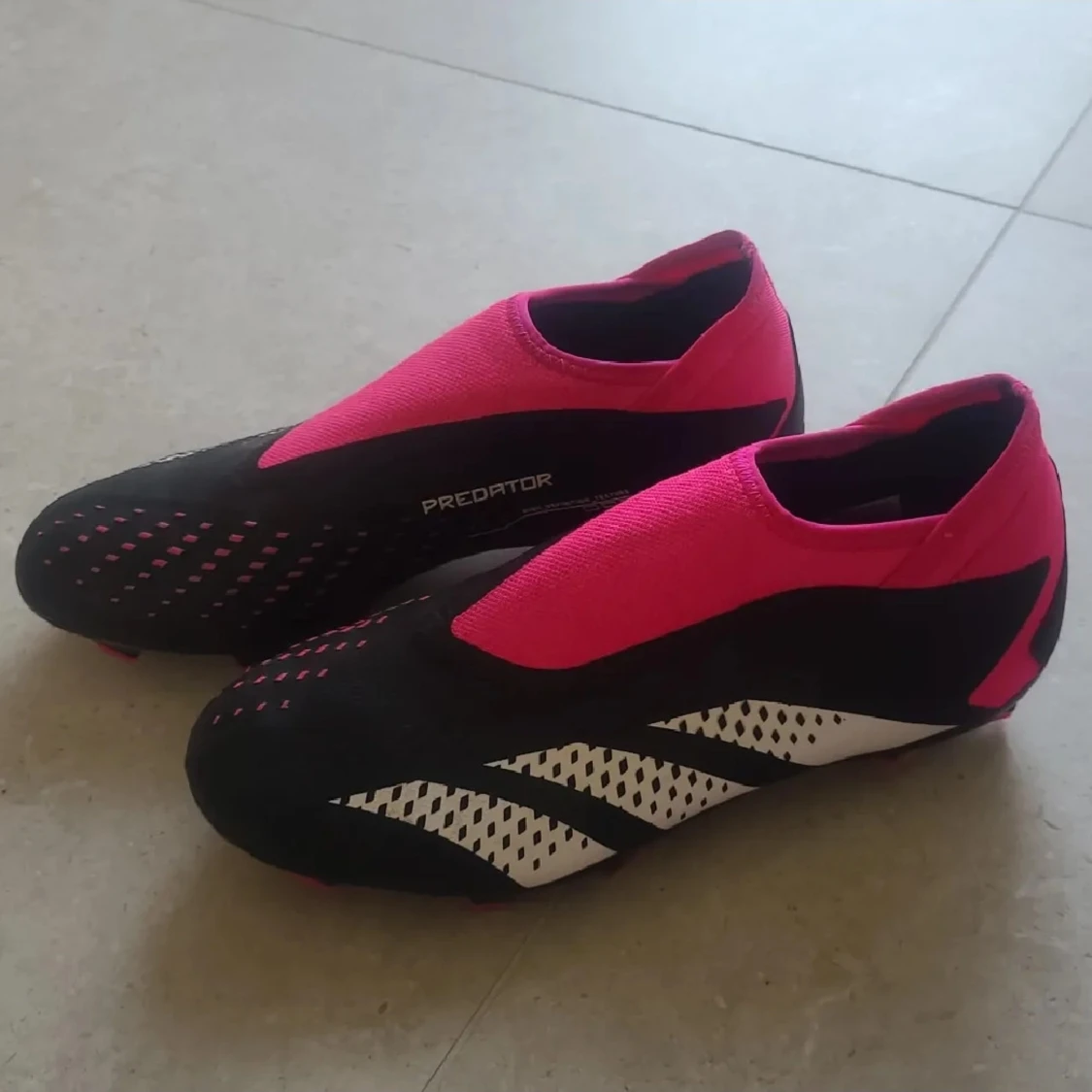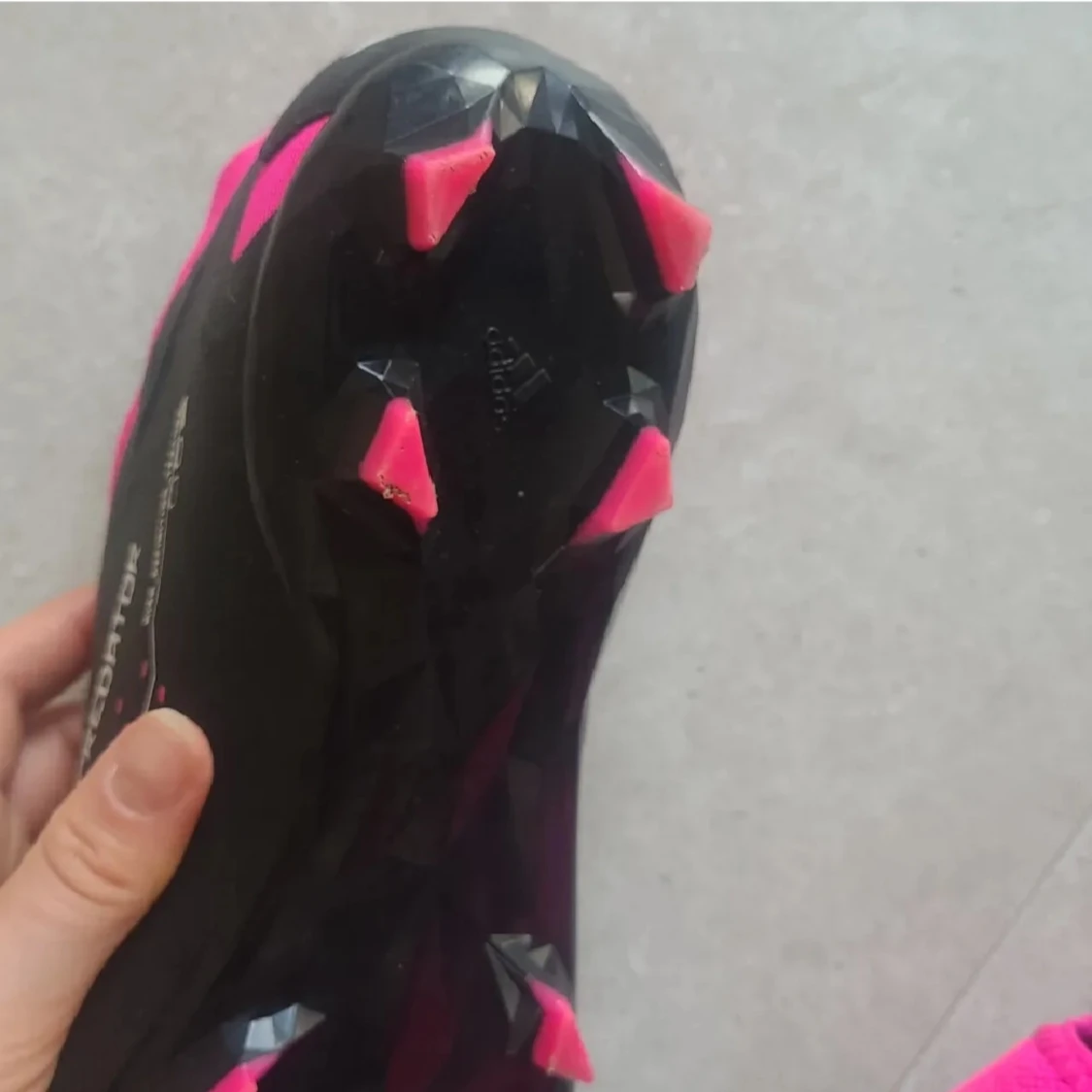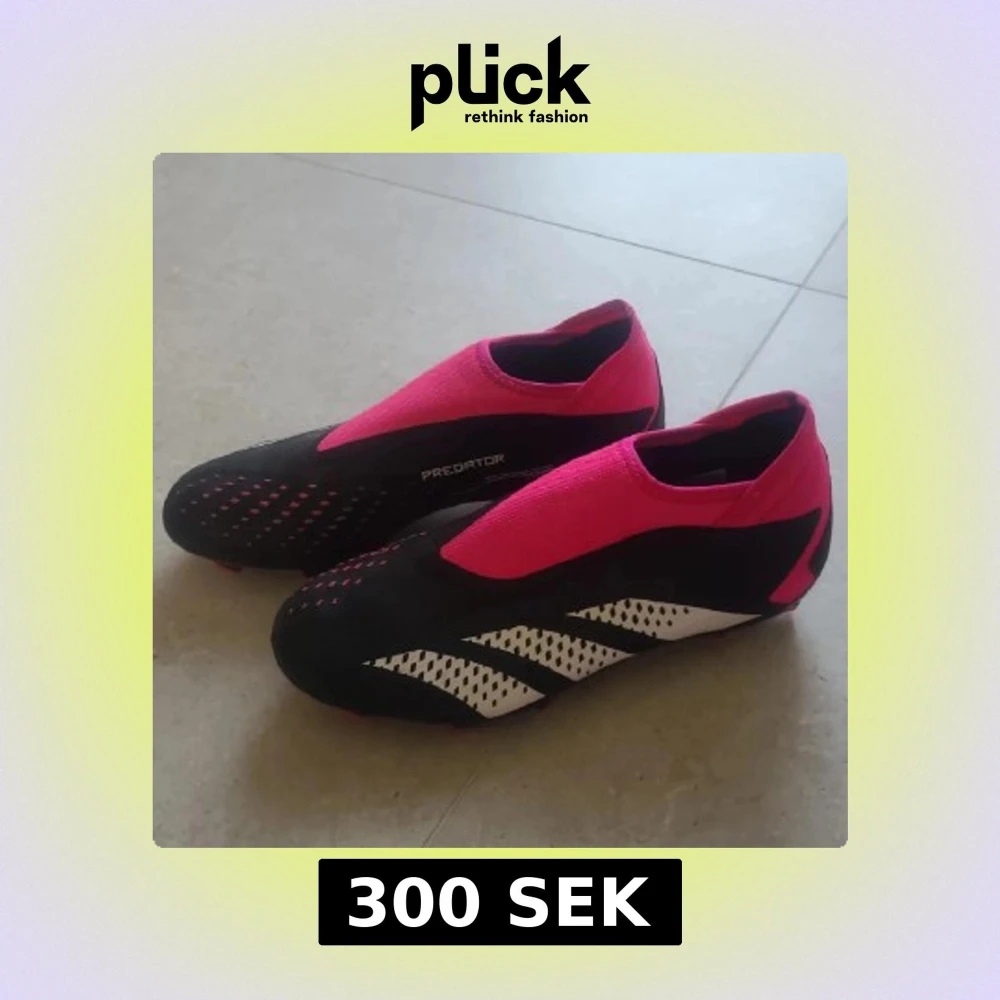 Svarta Adidas Predator fotbollsskor med rosa detaljer, i storlek 43. Använda ett par gånger men fortfarande i bra skick. Nypris 799kr