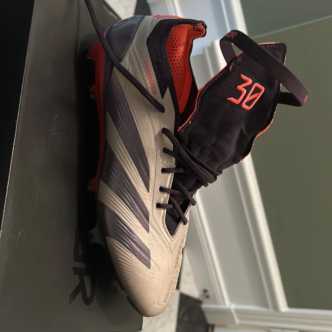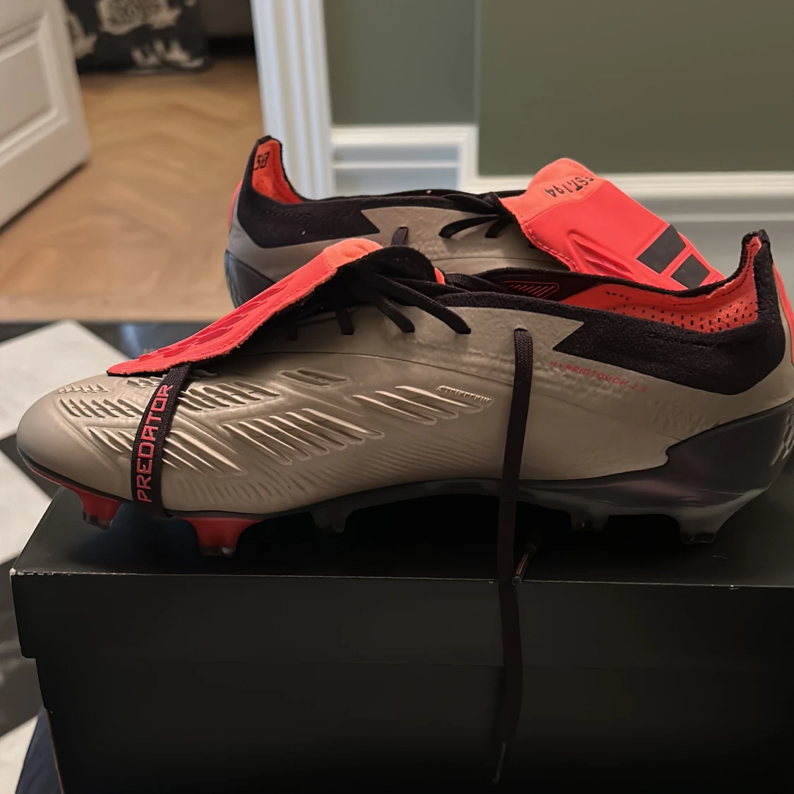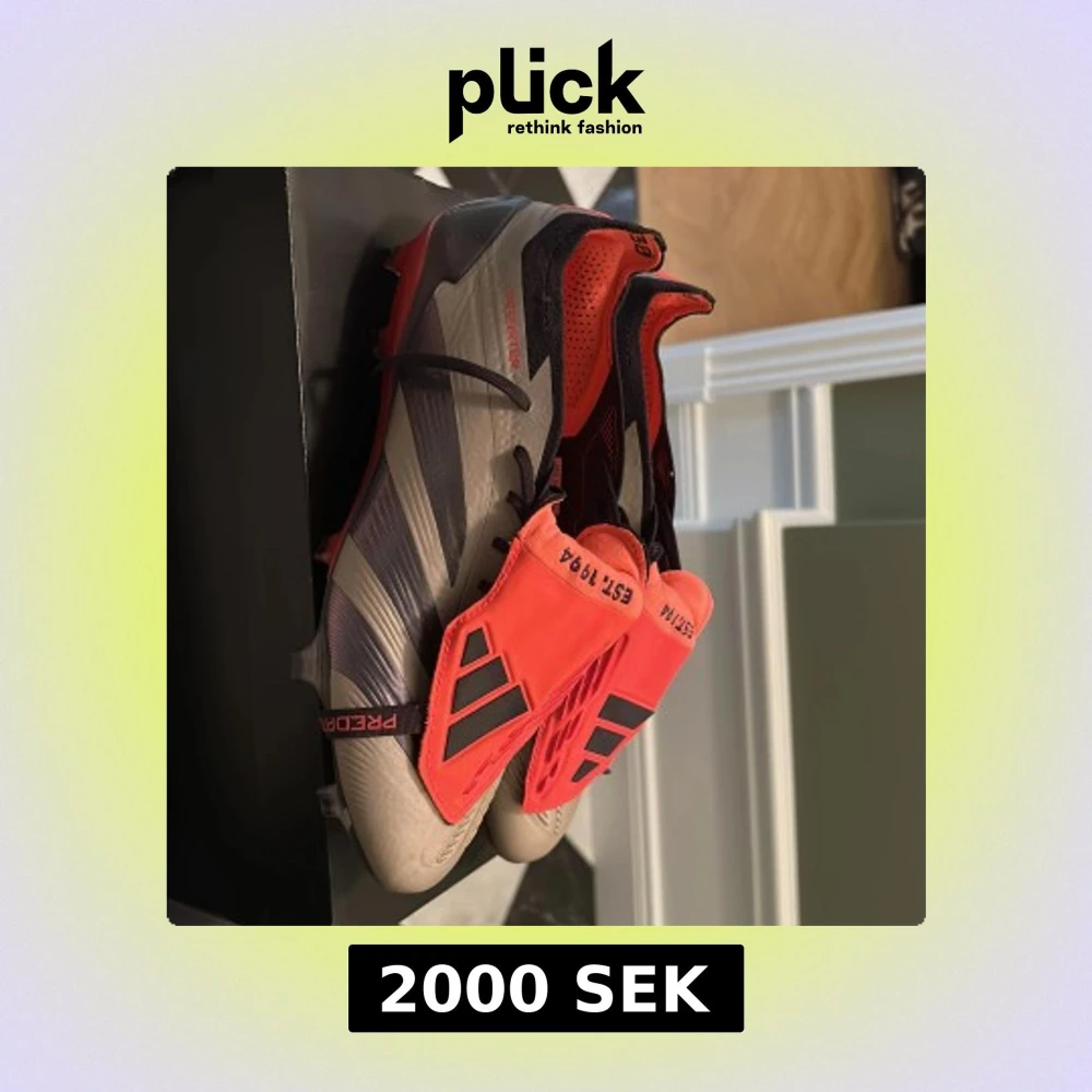 Snygga Adidas Predator fotbollsskor i grått och rött med svarta detaljer. Butikpris är 3100kr Skorna har snörning och en strömlinjeformad design för optimal prestanda på planen. Perfekta för fotbollsentusiaster som vill ha stil och funktionalitet. Använda en gång i 30 min bara, säljer pga fel storlek och kan inte lämna tillbaka!