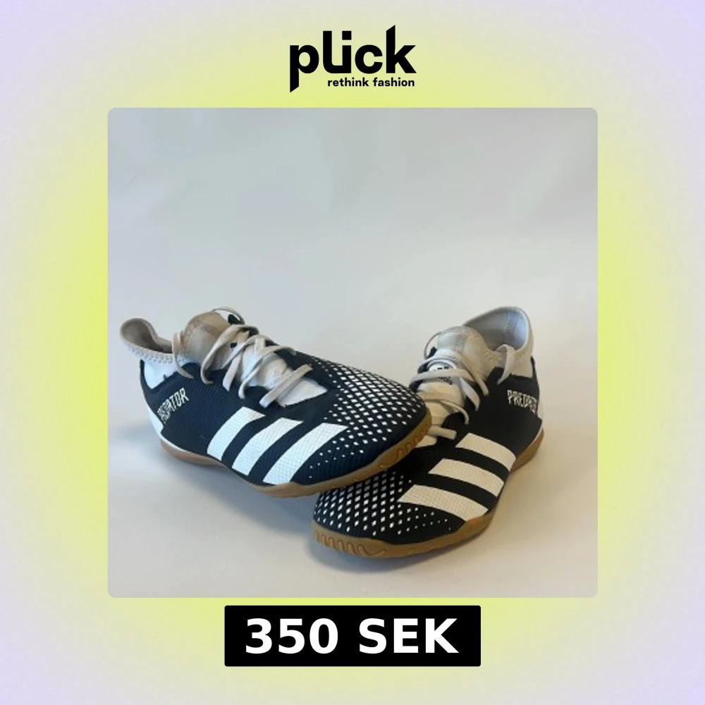 Adidas Predator fotbollsskor i svart och vitt med klassiska ränder och mönstrad ovandel. Skorna har snörning och en platt gummisula som ger bra grepp på inomhusplan. Snygg och sportig design med tydlig Predator-logga på sidan.