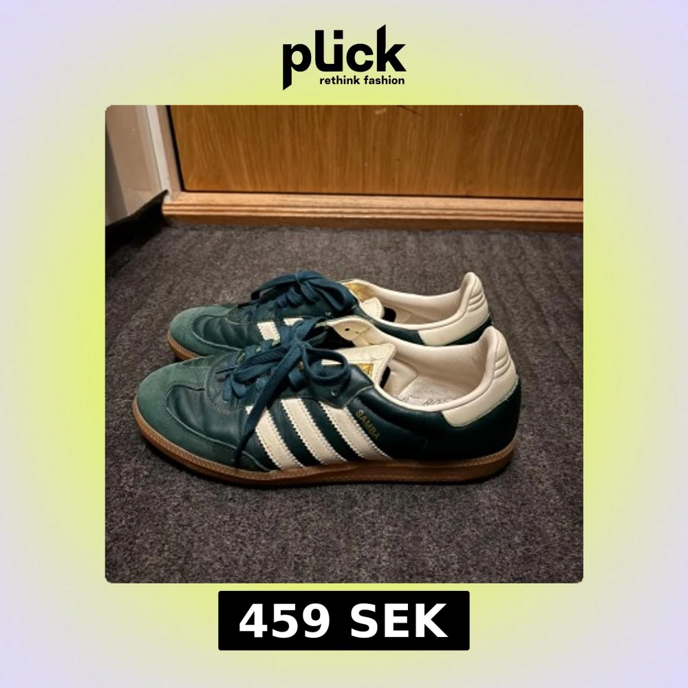 Snygga Adidas Samba sneakers i grönt med vita detaljer och klassiska tre ränder. Skorna har snörning och en gummisula som ger bra grepp. Perfekta för en sportig look.