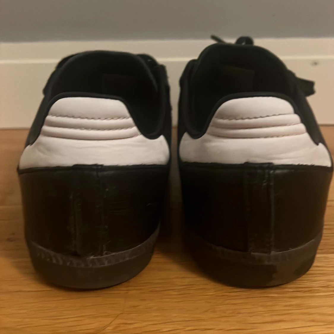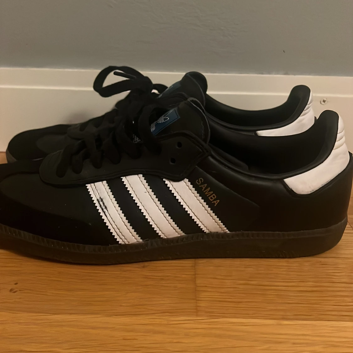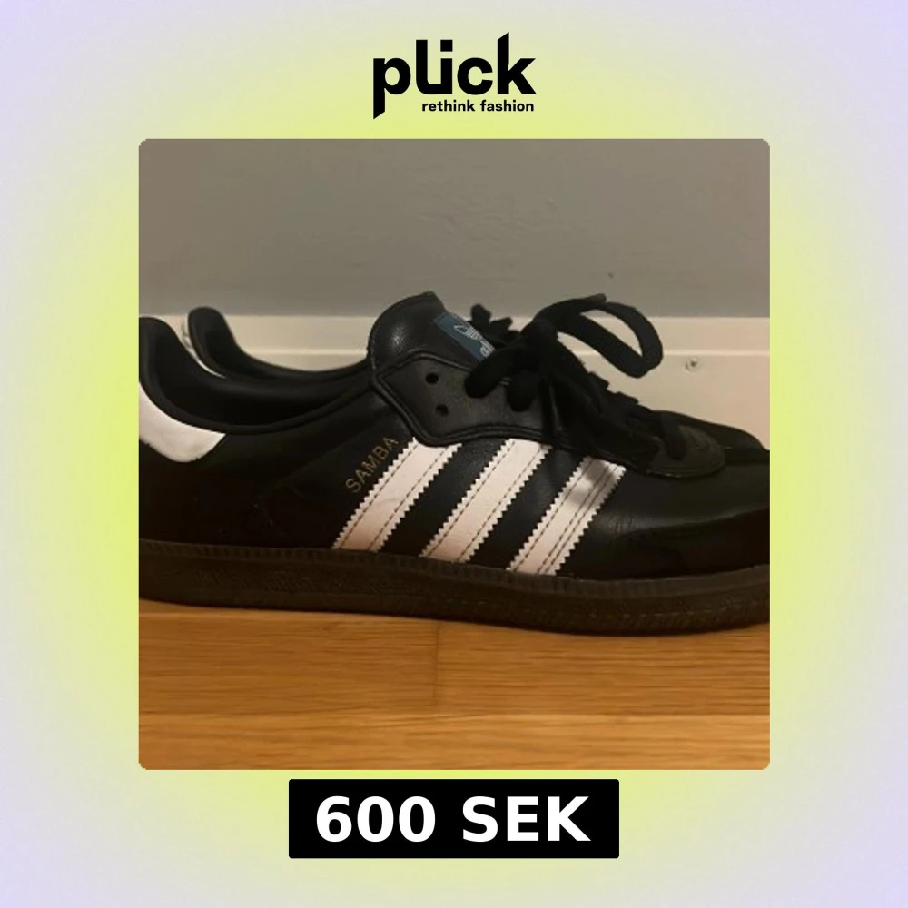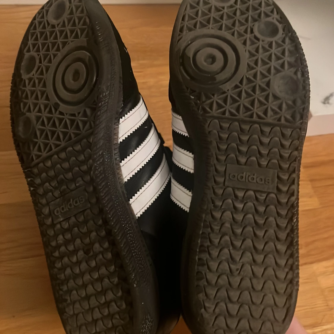 Klassiska Adidas Samba sneakers i svart och vitt. Skorna har de ikoniska tre ränderna på sidan och är tillverkade i skinn. Perfekta för en stilren och sportig look. Storlek 43 men passar även 42