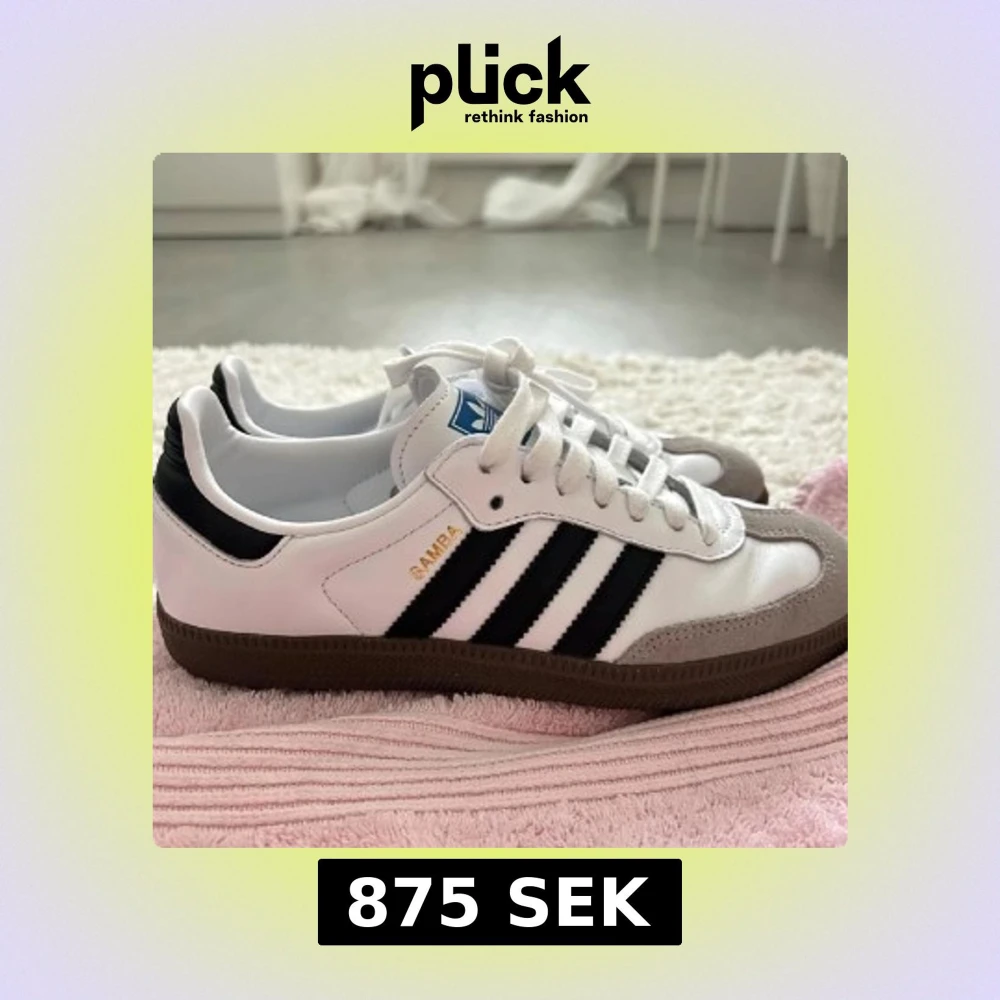 Klassiska Adidas Samba sneakers i vitt med svarta ränder och brun sula. Nyskick storlek 37,5