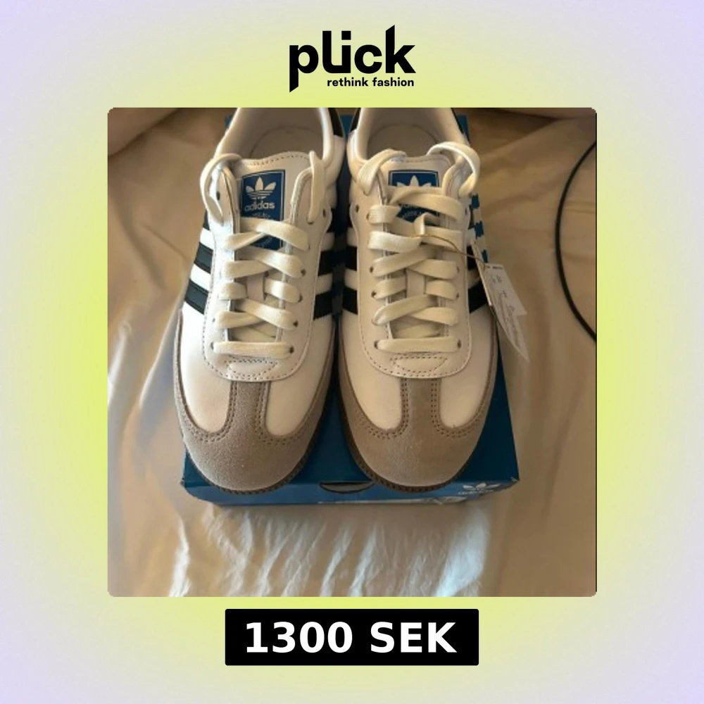 Säljer ett par Adidas Samba OG sneakers i vitt och svart lite beige aktig färg med snygga detaljer i mocka, brun sula, i storlek 39 1/3 tag och allting är kvar helt nya aldrig använda, köpta för 1449kr säljer då de är fel storlek för mig.