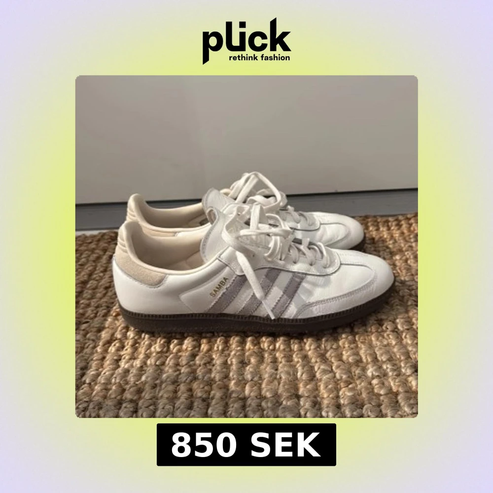 Klassiska Adidas Samba sneakers i färgen CWHITE/GRETWO/CREWHT. Skorna är använda endast en gång. Perfekta nu till sommaren.