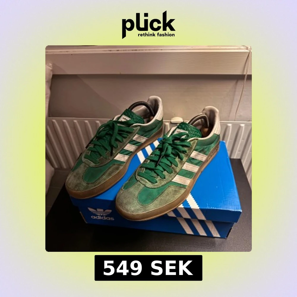 Adidas Samba OG sneakers i grön mocka och skinn med vita detaljer och klassiska tre ränder på sidan. Gummisula med mönster och gröna skosnören. Perfekt för dig som gillar retrostil och streetwear. Storlek 42 (EU), 8,5 (US).