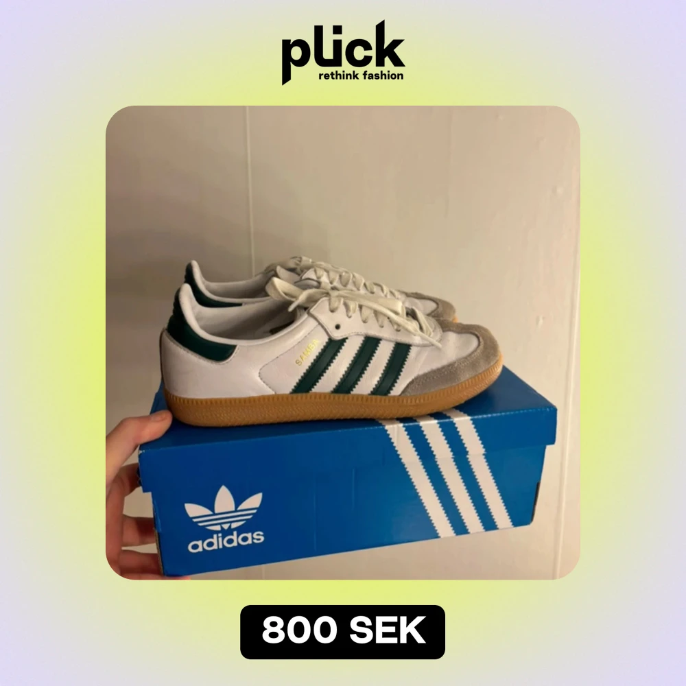 Säljer ett par klassiska Adidas Samba OG sneakers i vitt och grönt. Skorna har en snygg design med gröna ränder och en gummisula. Perfekta för både vardag och träning. De är i nytt skick och kommer i originalkartong.