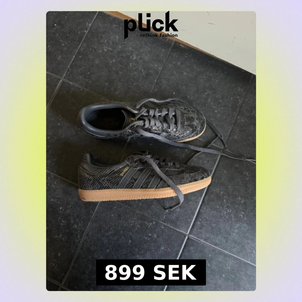 Säljer ett par Adidas Samba sneakers i svart med snyggt snakeskin-mönster och klassiska tre ränder på sidan. Storlek 38. Passar mig som har skostorlek 37. Endast använda 3 gånger