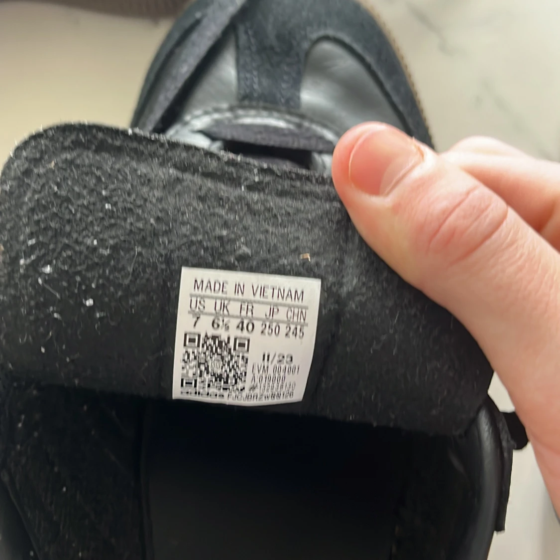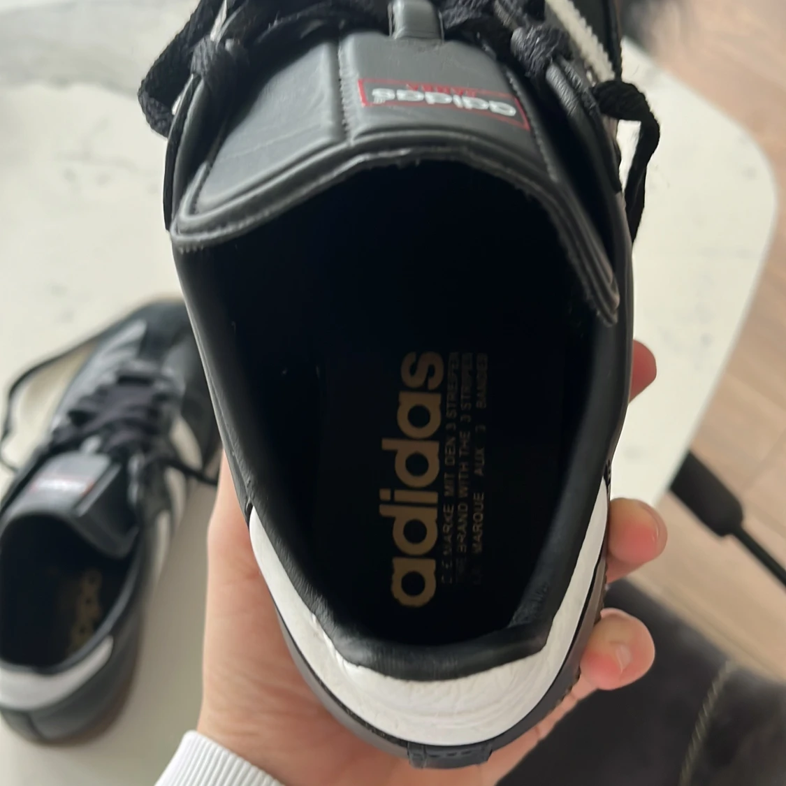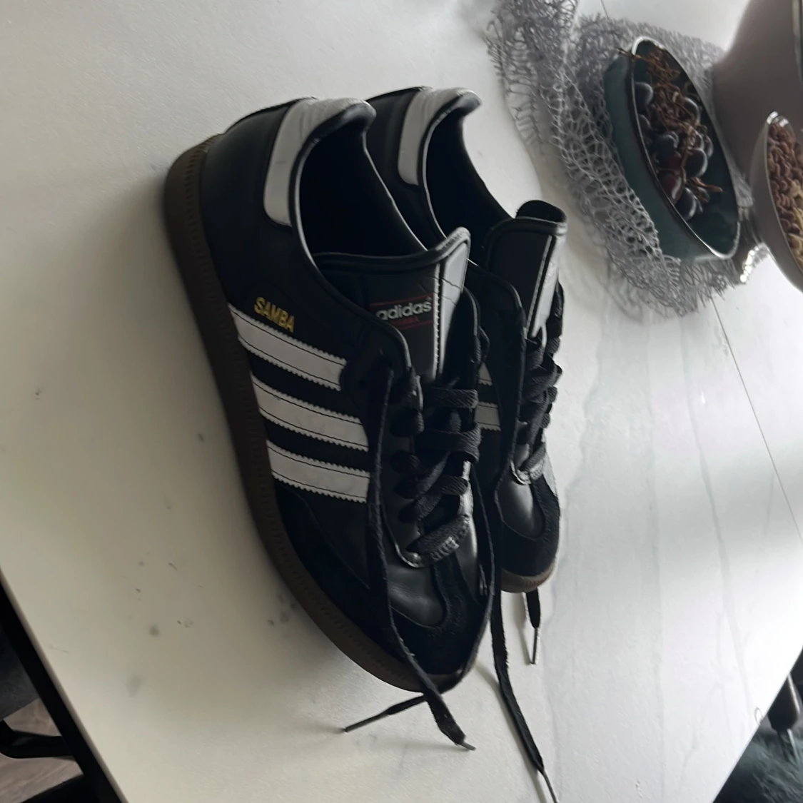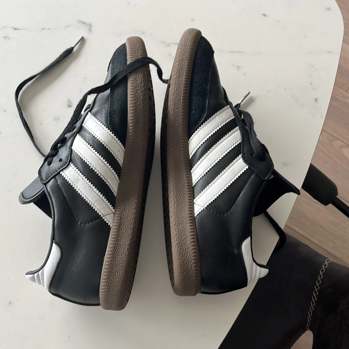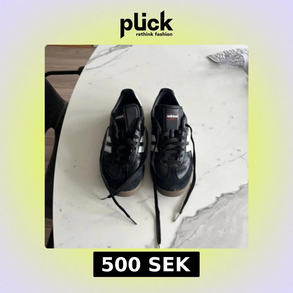 Säljer ett par klassiska Adidas Samba sneakers i svart med vita ränder och brun gummisula. Dessa skor köptes för en månad sedan och kostade cirka 1400. Skorna har används i en vecka inomhus men passade inte riktigt då tyckte dom satt lite tajt så köpte en storlek större och dom passade perfect. Priset kan diskuteras om skorna och det är bara att höra av sig.