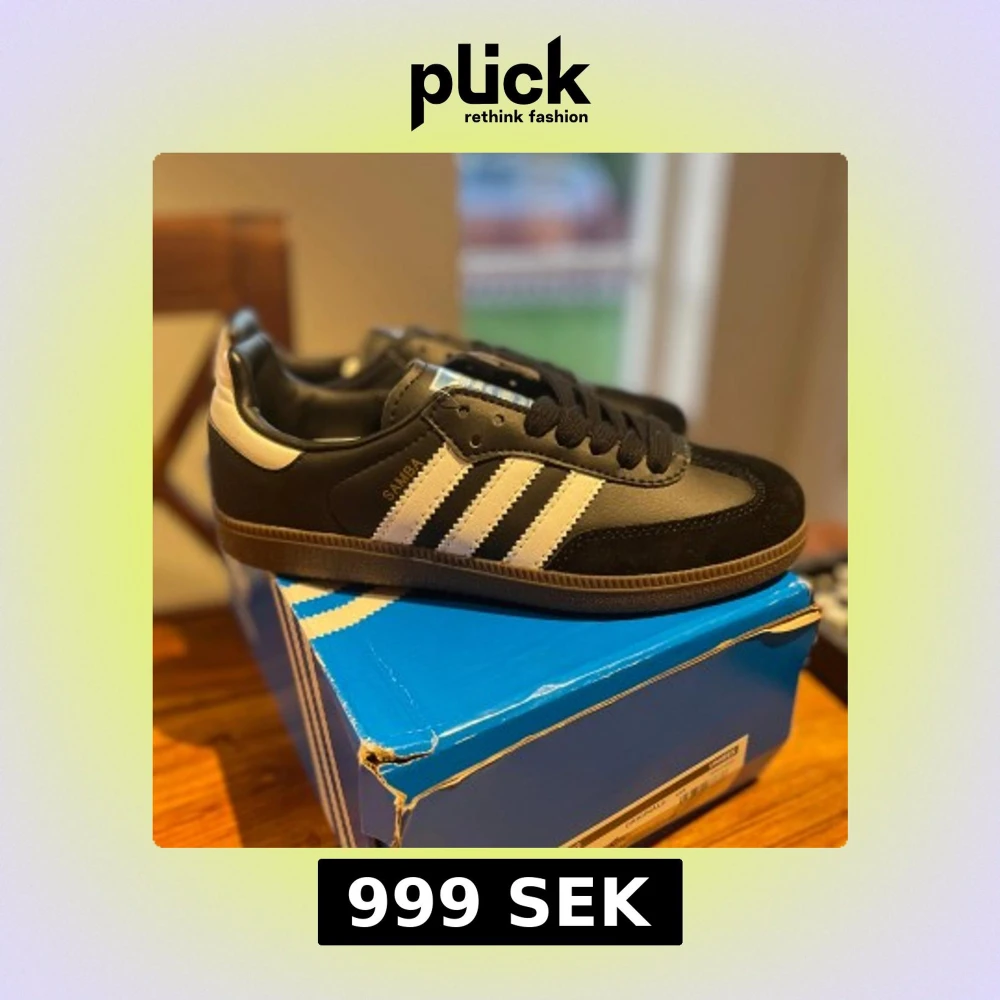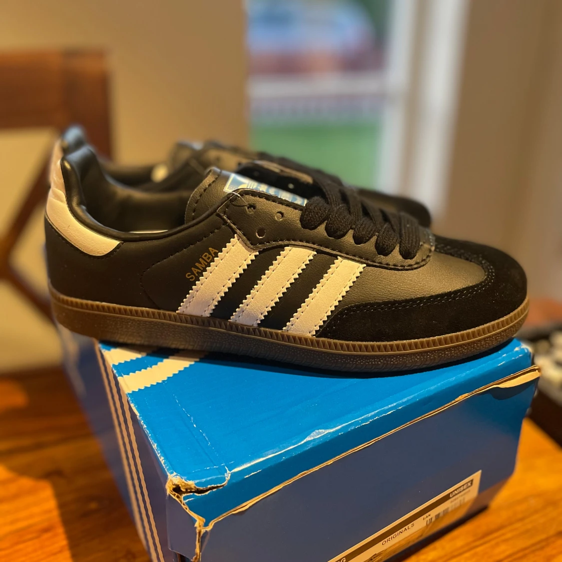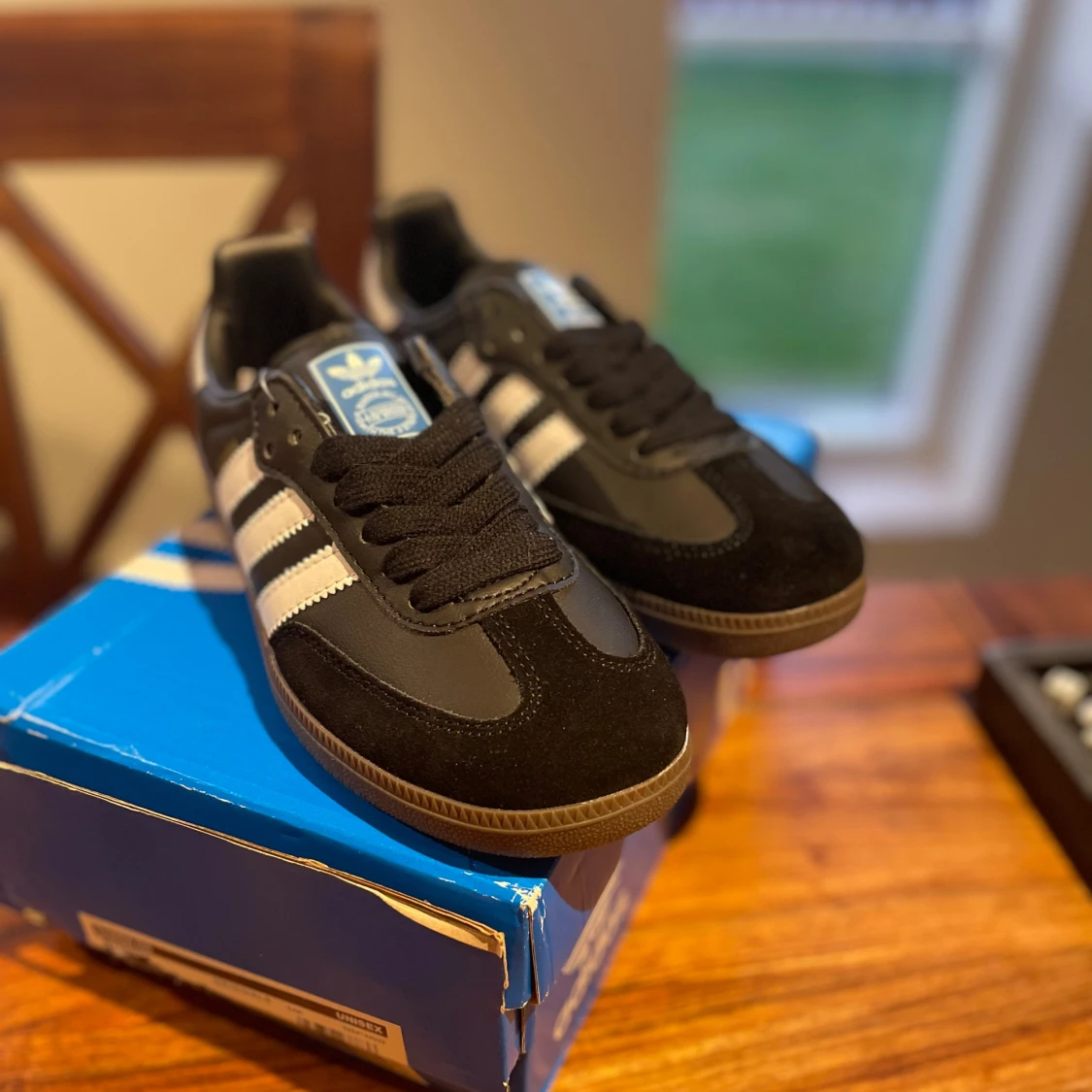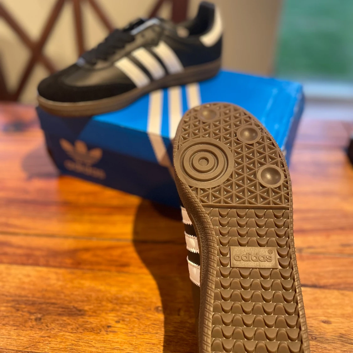 Klassiska Adidas Samba sneakers i svart och vitt med de ikoniska tre ränderna på sidan. Ovandel i skinn och mocka, bruna gummisulor och svart snörning. Perfekta för dig som gillar retrostil och streetwear. Snygg detalj med guldfärgad Samba-text på sidan. Priset är inte hugget i sten