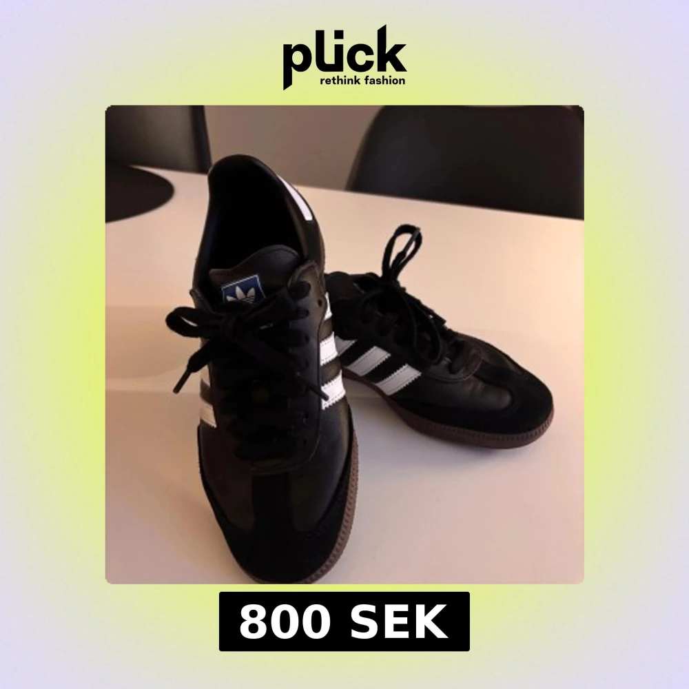 Adidas Samba sneakers i svart skinn med vita detaljer och klassiska tre ränder på sidorna. Brun gummisula, rund tå och snörning framtill. Endast använda fåtal gånger!