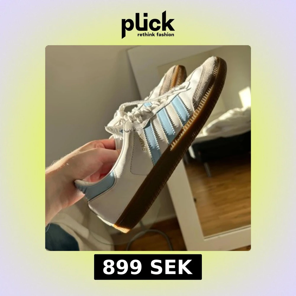 Säljer ett par unika Adidas Samba sneakers i vitt skinn med ljusblå detaljer sparsamt använd och klassiska tre ränder på sidan.