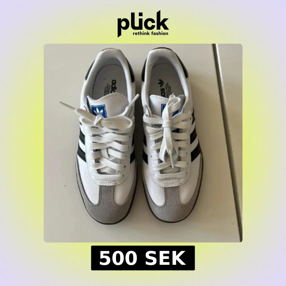 Säljer ett par klassiska Adidas Samba sneakers i vitt med svarta ränder och grå mockadetaljer vid tån. Skorna är använda en gång och är i ett mycket fint skick! Ord pris 1 449kr.