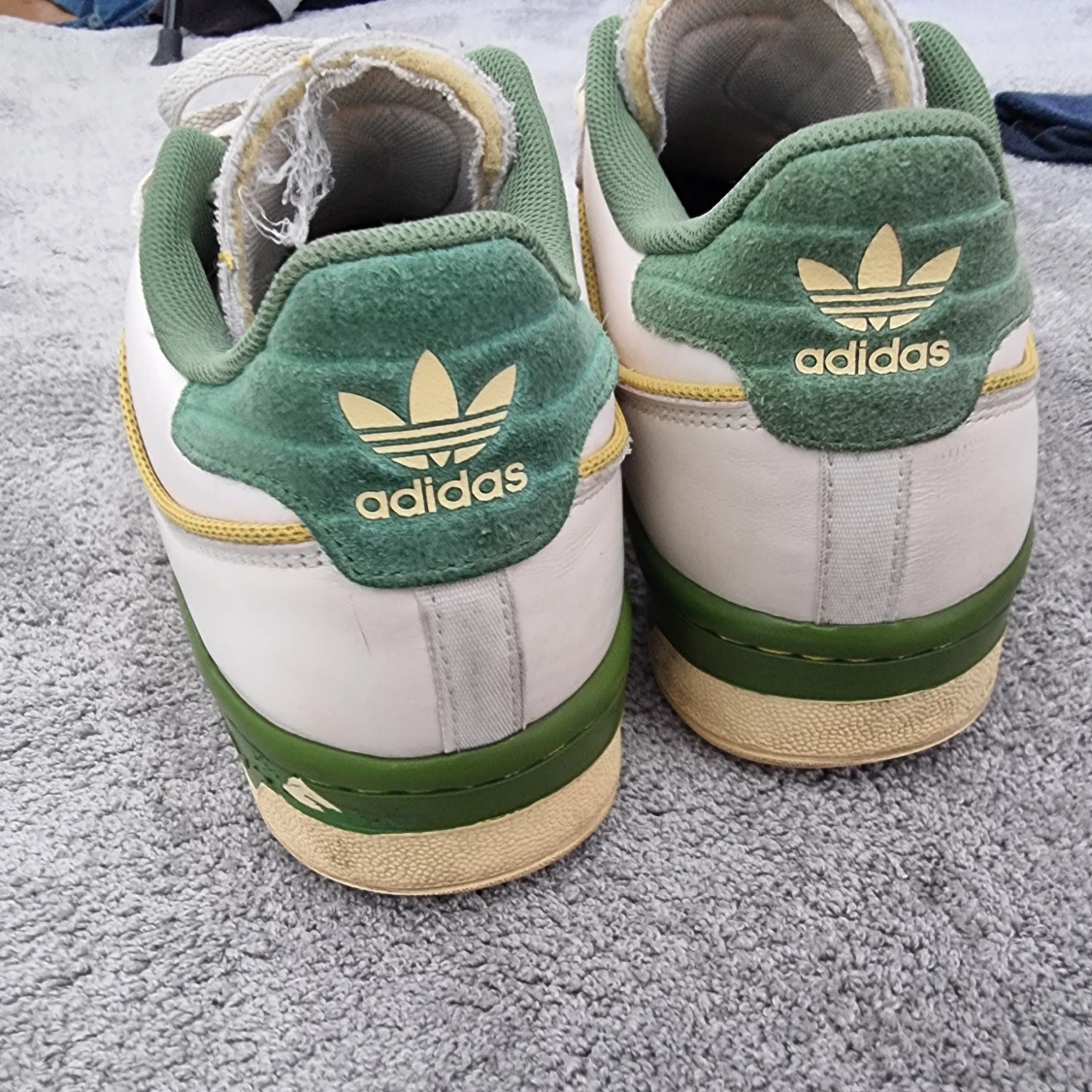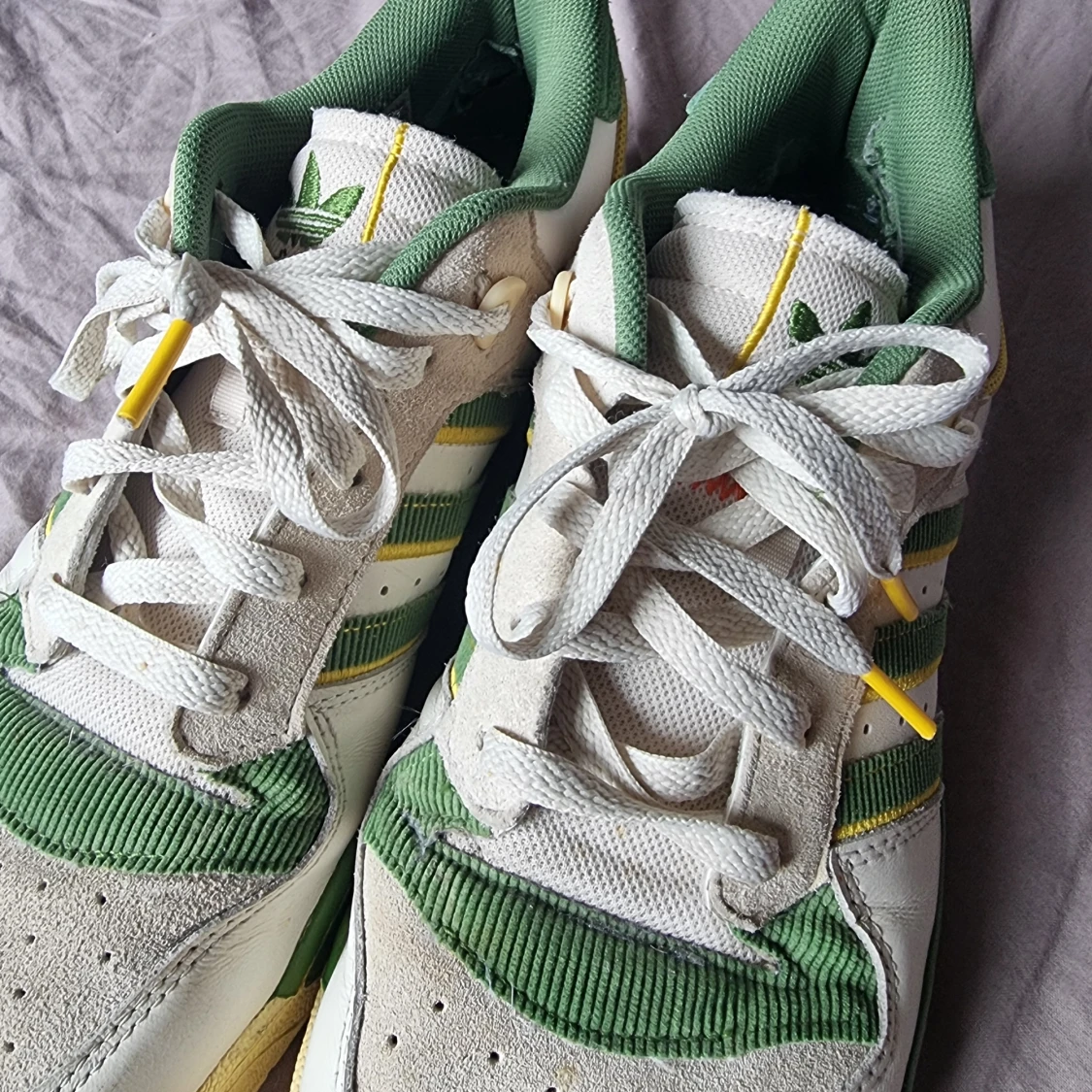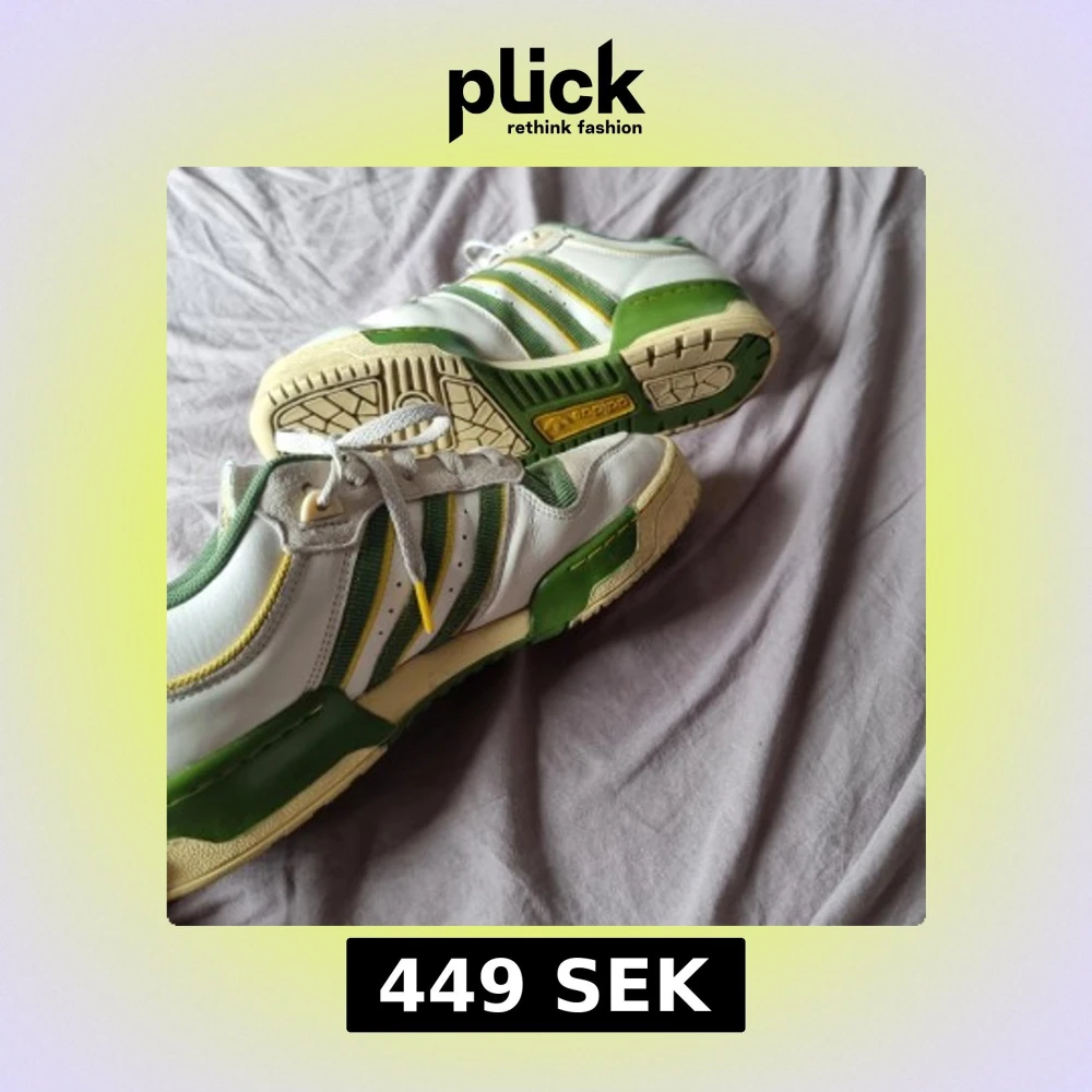 Unika Adidas sneakers med retrovibbar i vitt, grönt och gult. Skorna har klassiska tre ränder i grönt och gult, grön sula och detaljer i mocka och textil. Sköna att bära med snörning och rund tå. Perfekta för dig som gillar färg och old school-stil.