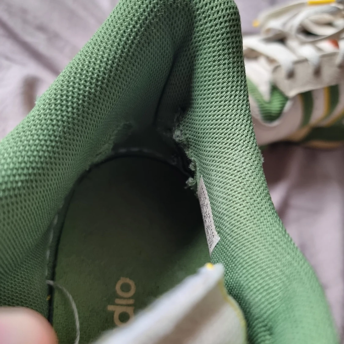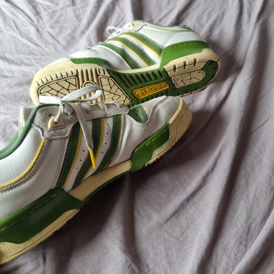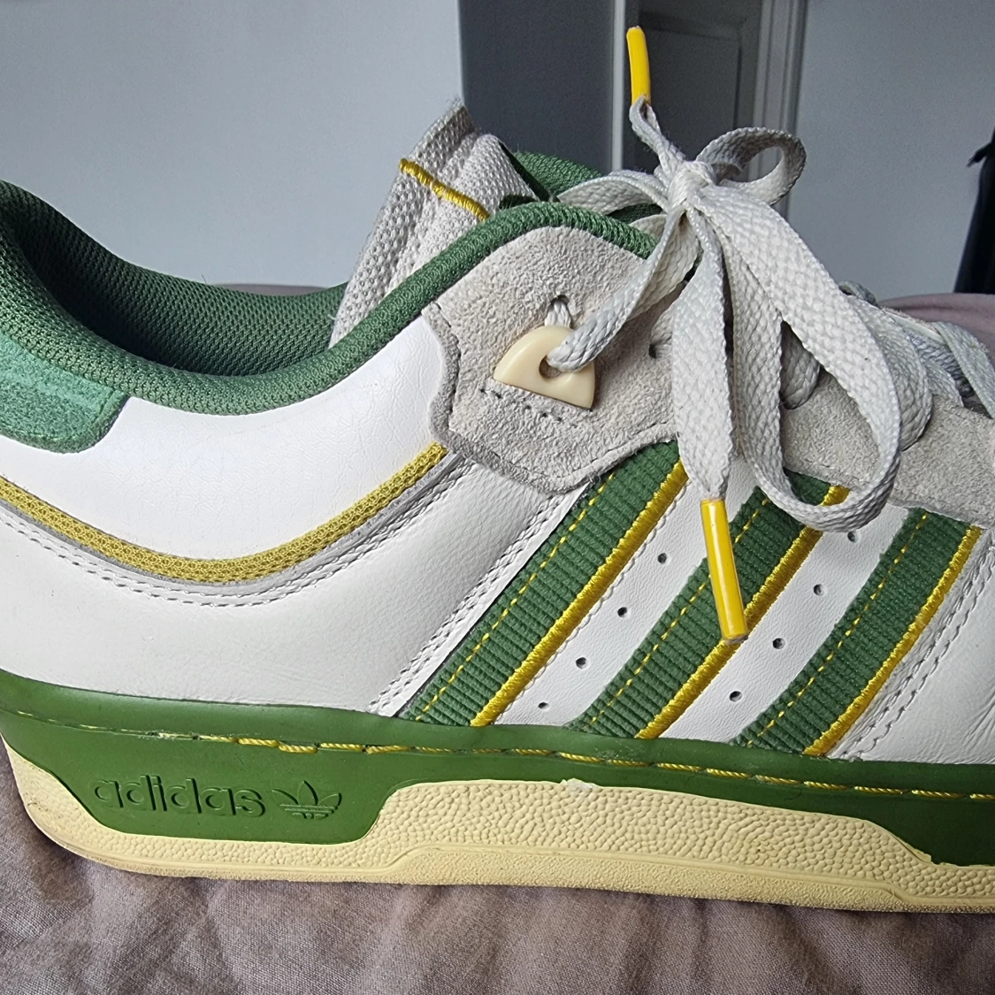 Unika Adidas sneakers med retrovibbar i vitt, grönt och gult. Skorna har klassiska tre ränder i grönt och gult, grön sula och detaljer i mocka och textil. Sköna att bära med snörning och rund tå. Perfekta för dig som gillar färg och old school-stil.
