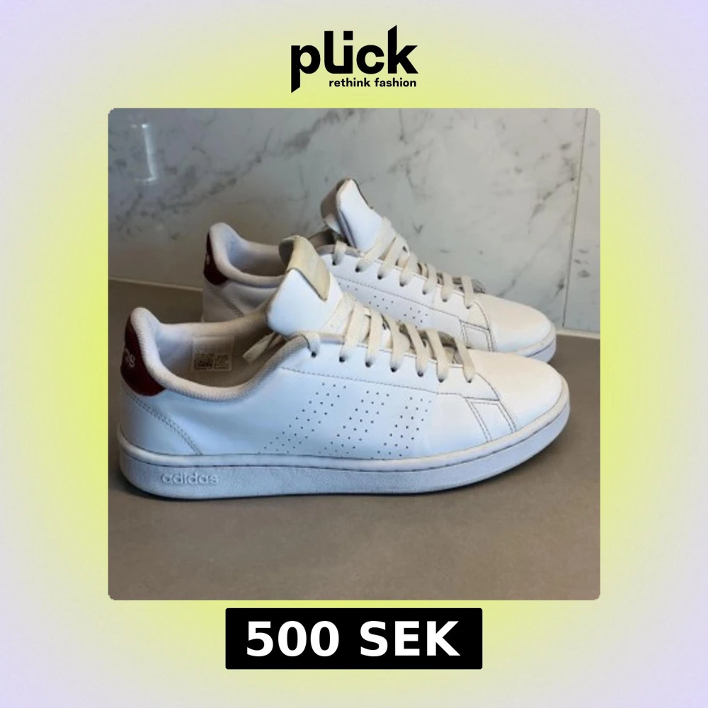 Fräscha vita Adidas sneakers med röda detaljer på hälen och klassisk logga. Skorna har perforerade ränder på sidorna, rund tå och platt sula. Tillverkade i skinn med snörning framtill. Perfekt för dig som gillar stilrena och sportiga sneakers.