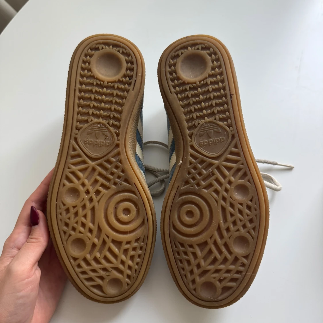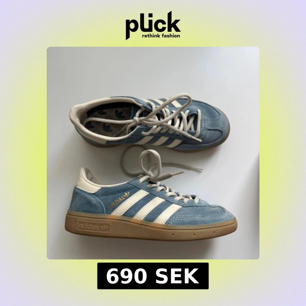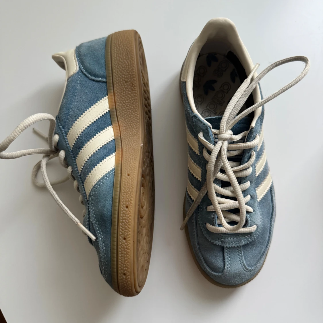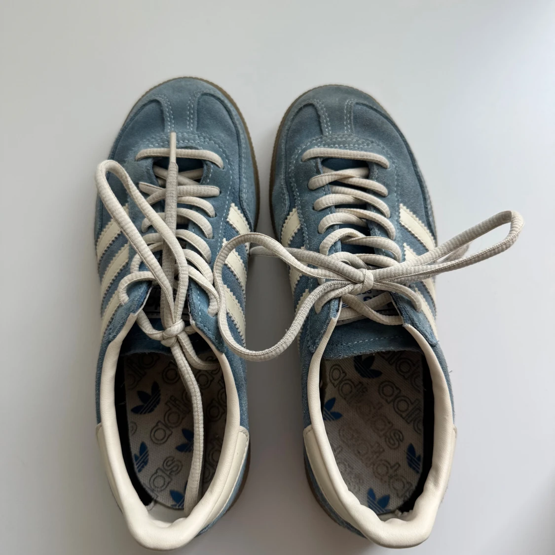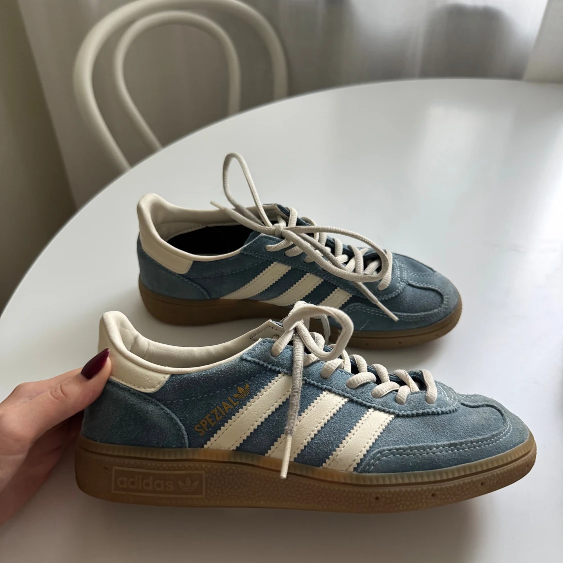 Säljer ett par Adidas Spezial sneakers i ljusblå mocka med vita detaljer.