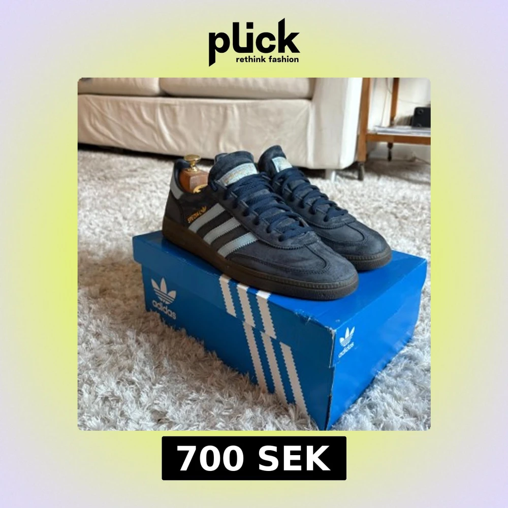 Adidas Spezial sneakers i mörkblå mocka med ljusblå ränder på sidorna och guldtext. Klassisk låg modell med rund tå och platt sula. Skorna har snörning och retrovibe, perfekt för dig som gillar stilrena och tidlösa sneakers. Skorna har inga som helst skador.
