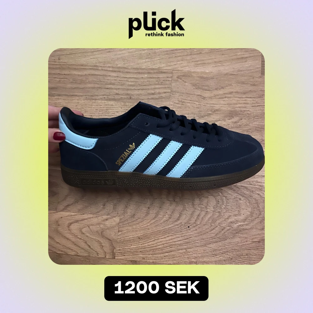 Säljer ett par snygga Adidas Spezial sneakers i mycket bra skick. Skorna är mörkblå med ljusblå ränder och har en klassisk design. Perfekta för både vardag och fest! De har en bekväm passform och är tillverkade i syntetmaterial. Helt nya!🫶🏽 kommer i originalförpackning
