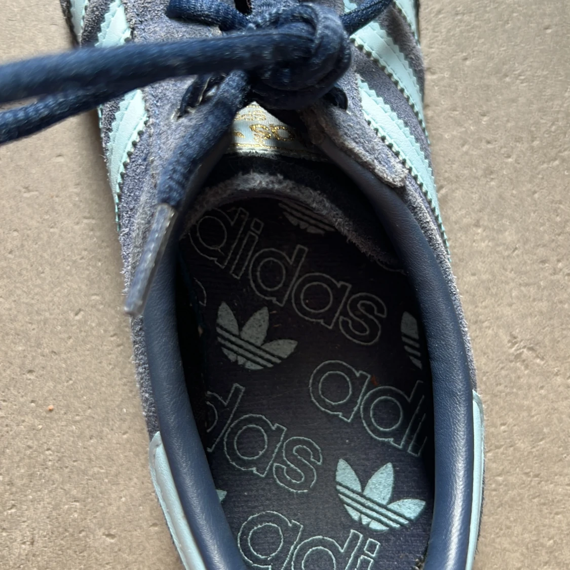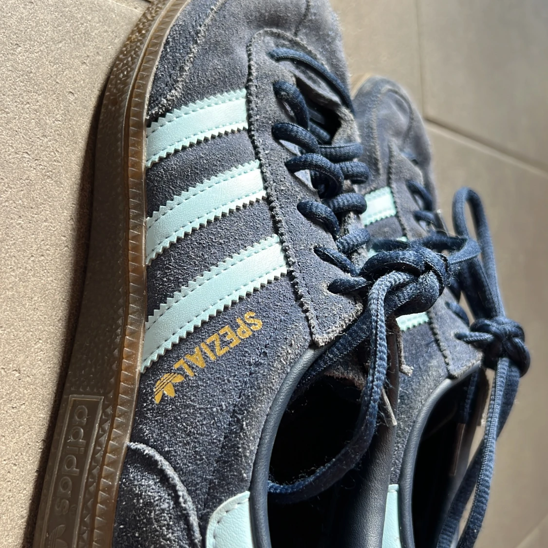 Säljer ett par Adidas Spezial sneakers i blå mocka med ljusblå ränder och klassisk gummisula. Skorna har snörning och den ikoniska Adidas-loggan i guld på sidan. Insidan är mönstrad med Adidas-tryck. Perfekta för dig som gillar retrostil och streetwear.
