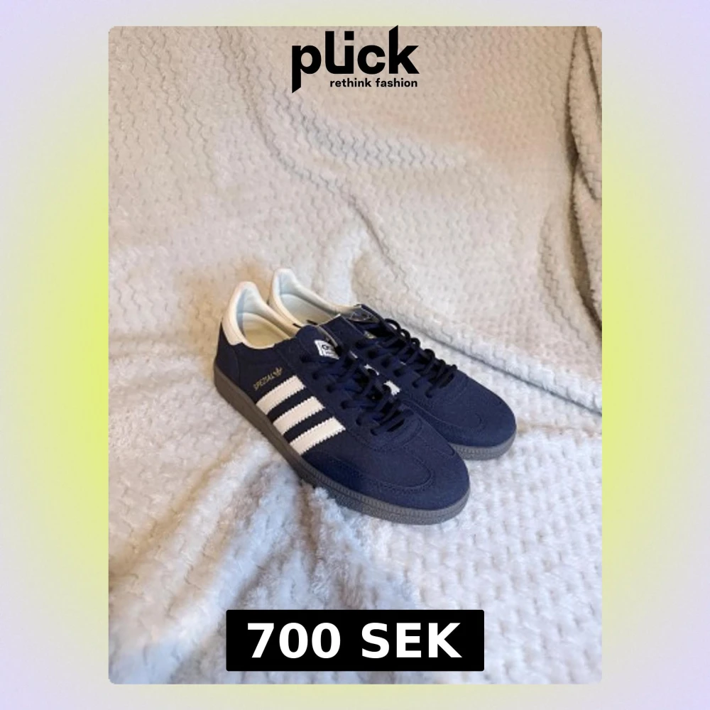 Adidas Spezial sneakers i marinblå mocka med klassiska vita ränder och vit häl. Snygg retrostil med grå platt sula och rund tå. Skorna har snörning och guldfärgad Spezial-logga på sidan. Perfekta för dig som gillar streetwear och sportig vibe.