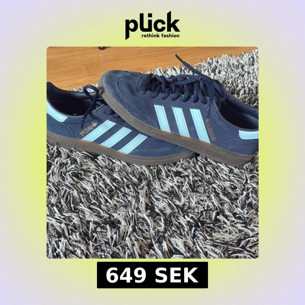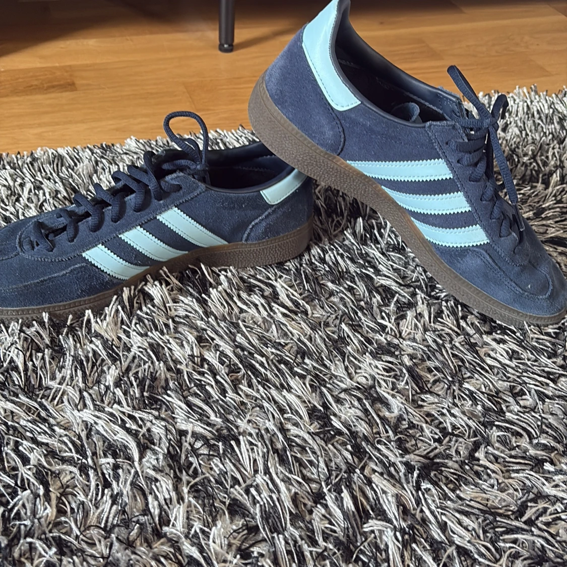 Säljer ett par Adidas Spezial sneakers i marinblå mocka med ljusblå ränder och detaljer. Skorna har klassisk brun gummisula, snörning och rund tå. Ikonisk retrostil med guldfärgad Spezial-logga på sidan. Perfekta för dig som gillar streetwear och snygga detaljer.