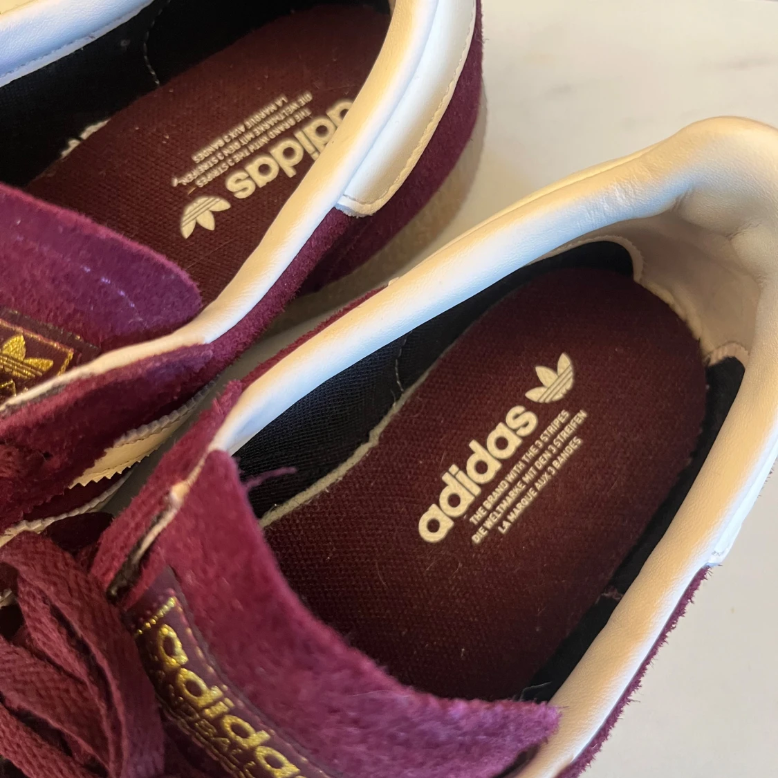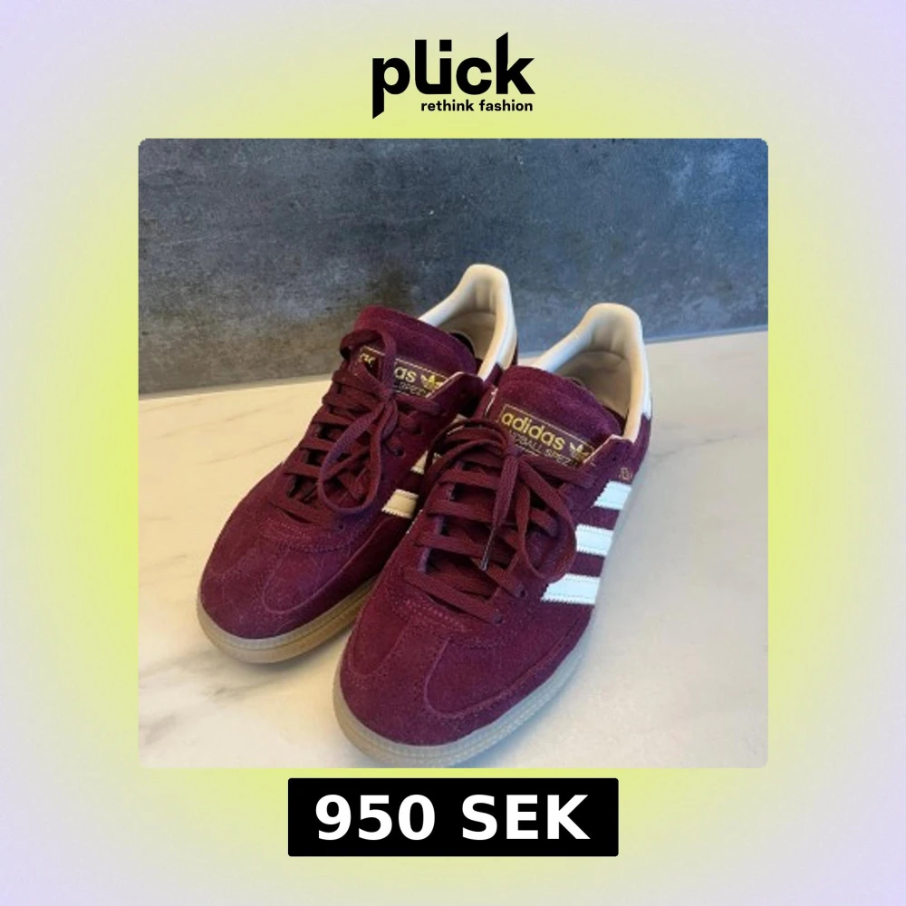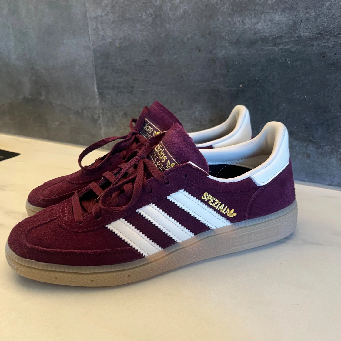 Säljer ett par vinröda Adidas Spezial sneakers i mocka med vita detaljer och klassiska tre ränder på sidorna. Skorna är i perfekt skick. Använda endast ett par gånger. Nypris 1399.