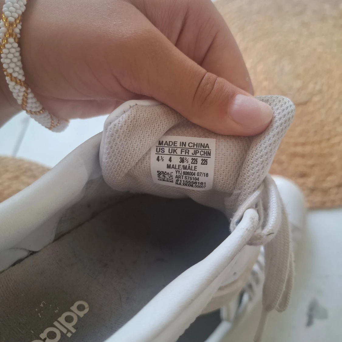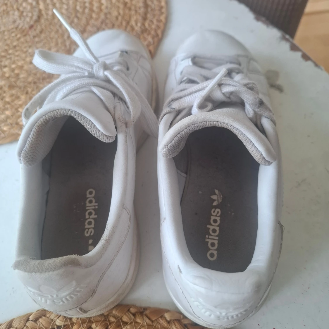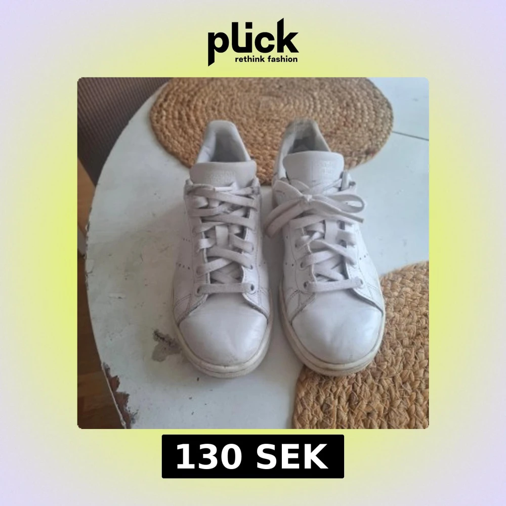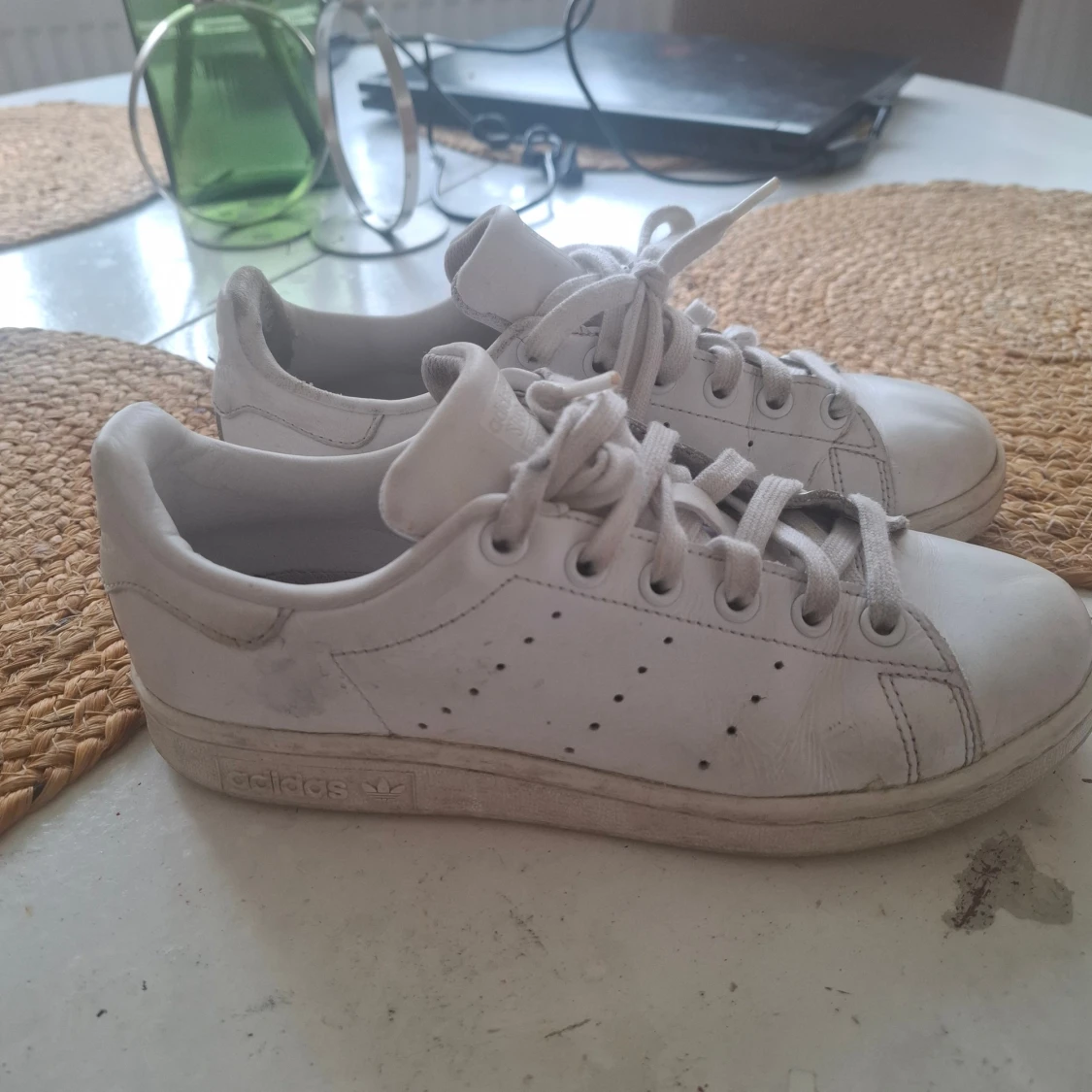 Klassiska vita Adidas Stan Smith sneakers med snörning och perforerade detaljer på sidorna. Skorna har rund tå, platt sula och är tillverkade i skinn. Perfekta för en clean och tidlös stil.