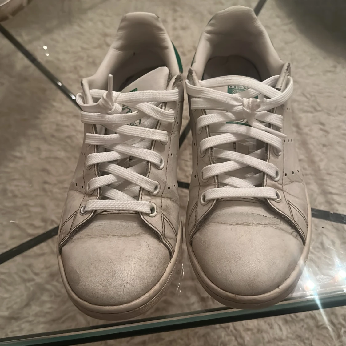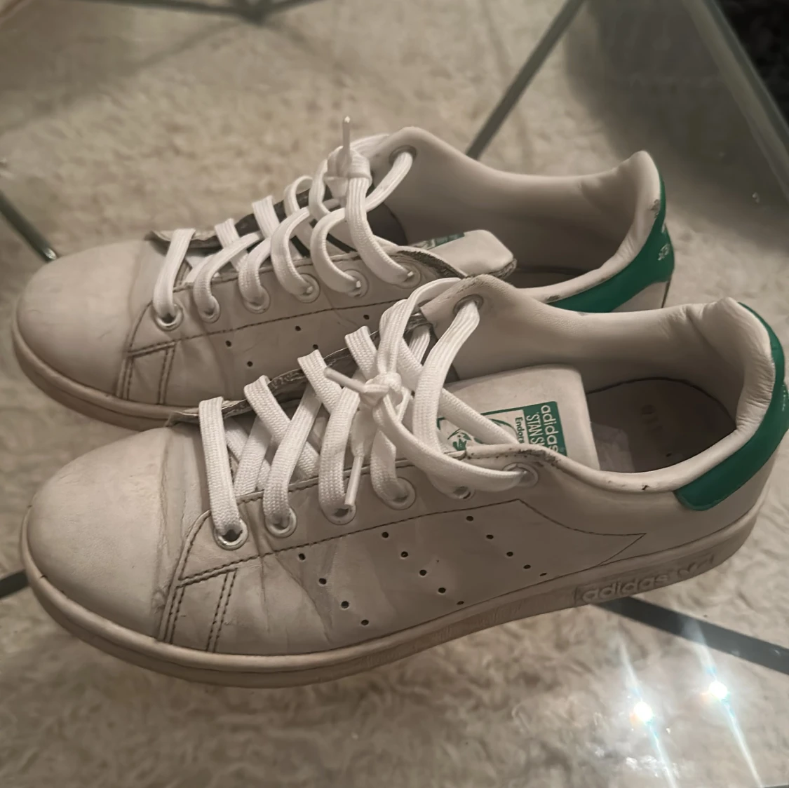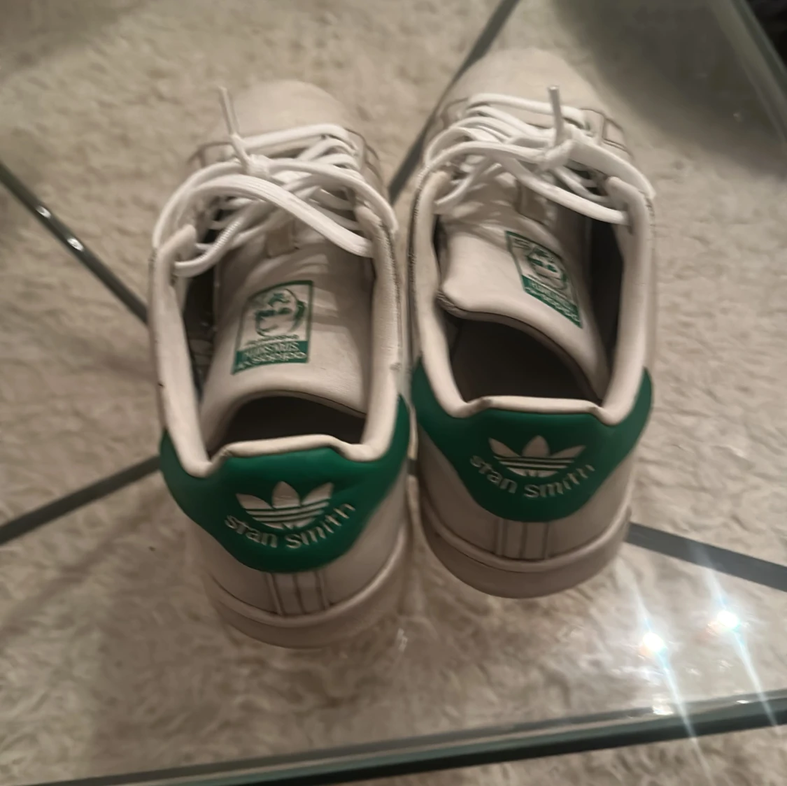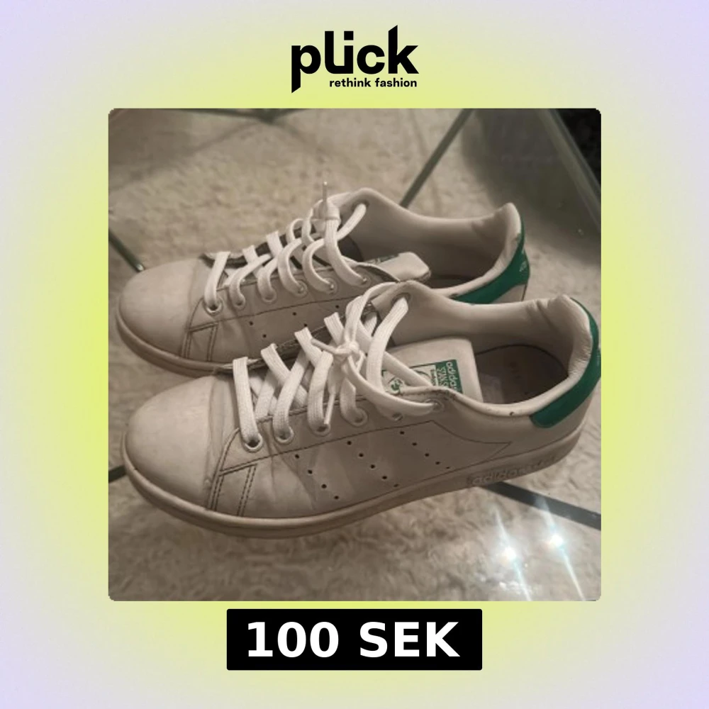 Klassiska Adidas Stan Smith sneakers i vitt skinn med gröna detaljer på hälen och tungan. Skorna har rund tå, platt sula och snörning framtill. Perfekta för en clean och tidlös look, passar till det mesta i garderoben.
