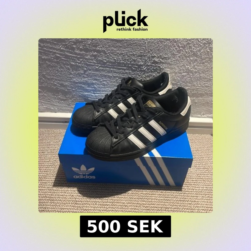 Säljer ett par Adidas Superstar, köpta på footlocker, lådan finns, vid hälen av båda skorna är fodret lite trasigt men det känns inte vid användning, kontakta gärna vid frågor!