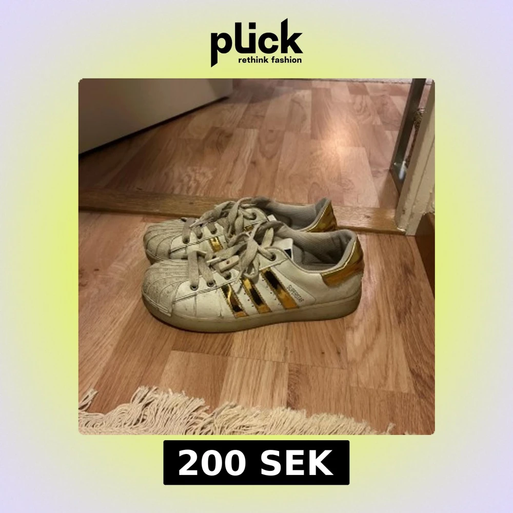 Unika Adidas Superstar sneakers i vitt med guldiga detaljer. Ser väldigt smutsiga ut på bilden men är i bättre skick i verkligenheten