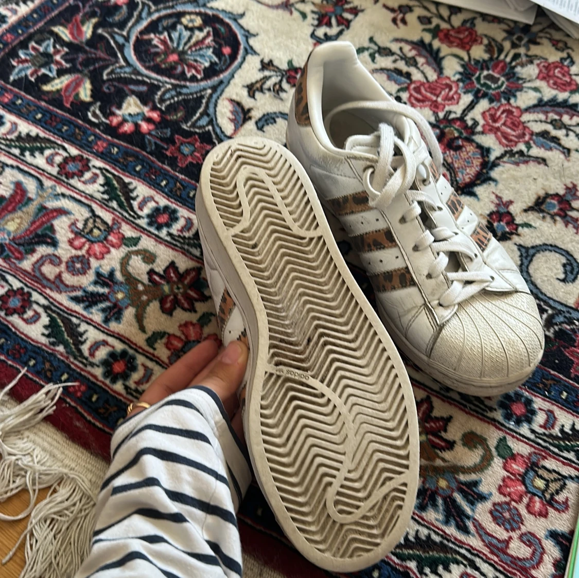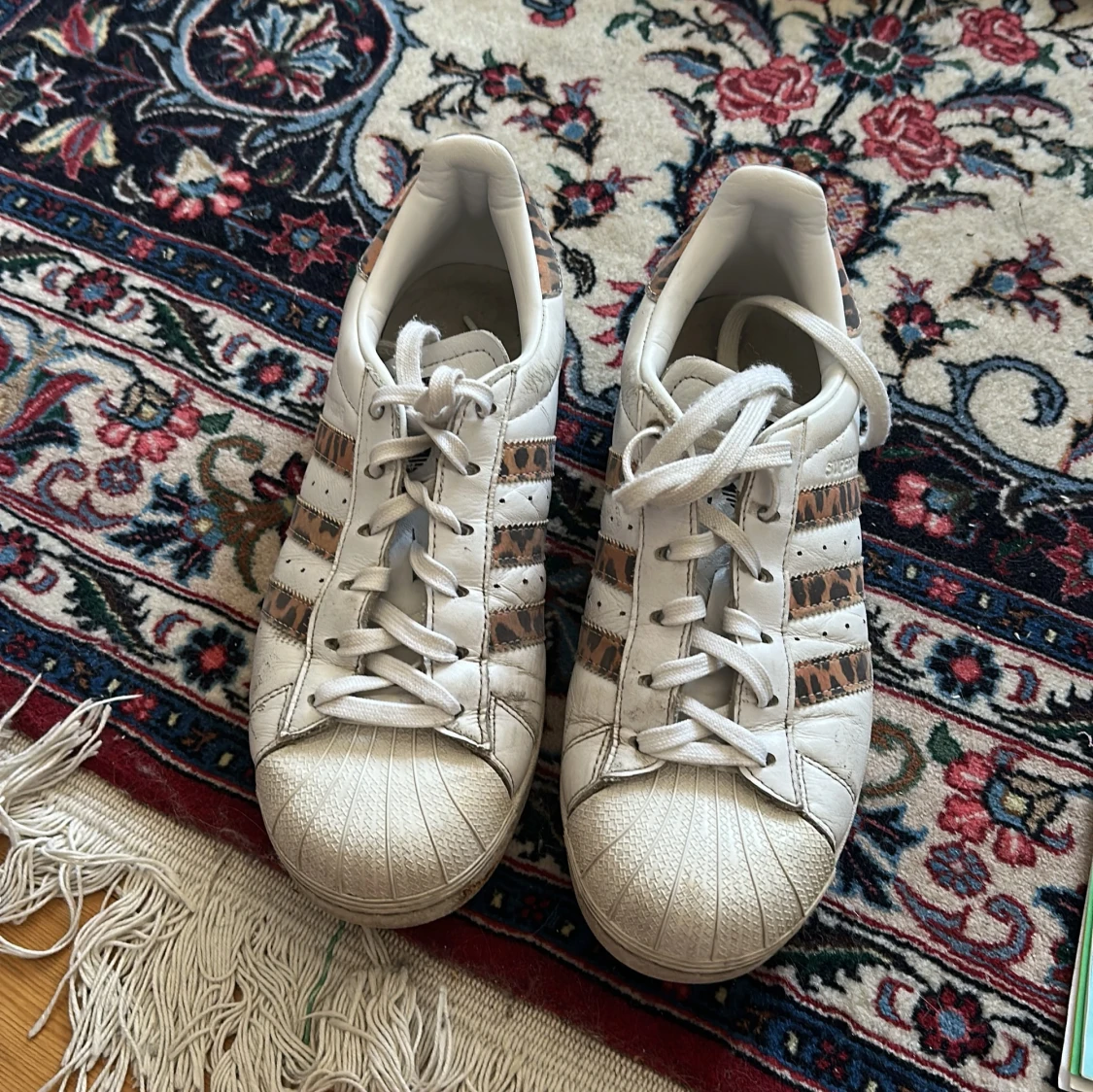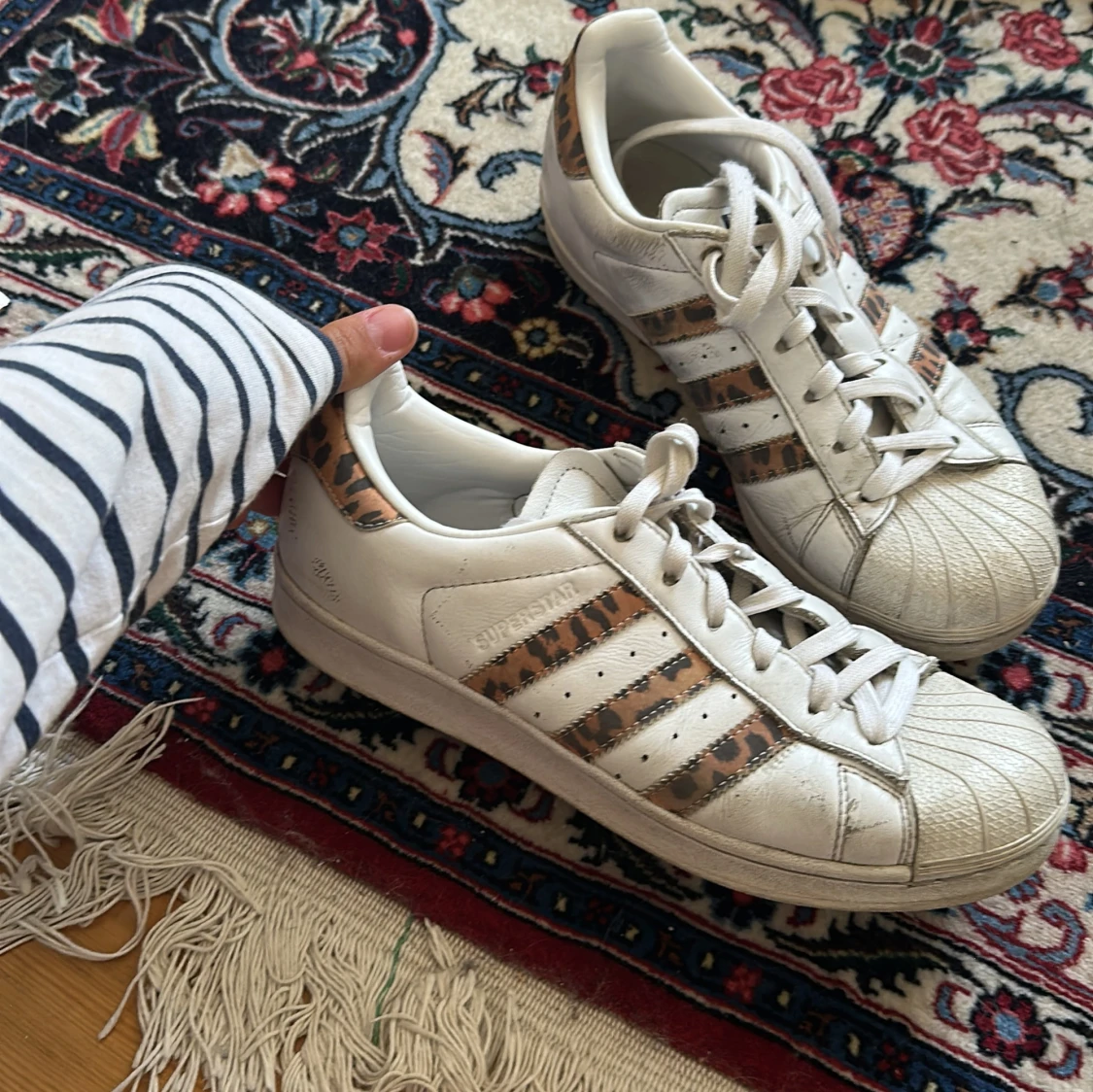 Snygga vita Adidas Superstar sneakers med klassisk snörning och coola leopardmönstrade detaljer på de ikoniska tre ränderna och hälen. Skorna har rund tå, platt sula och är tillverkade i skinn. Perfekta för dig som vill sticka ut med en unik twist på en tidlös modell.