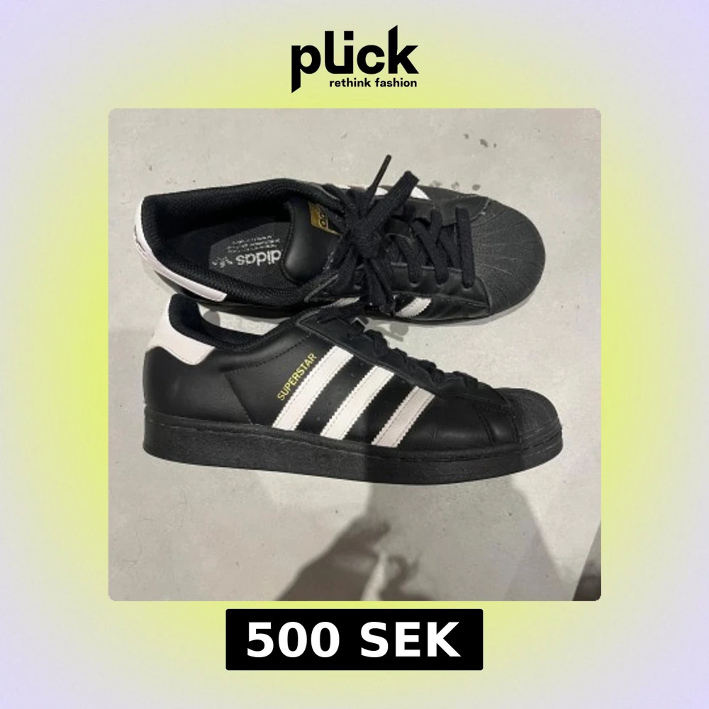 Klassiska Adidas Superstar sneakers i svart skinn med vita detaljer skorna har använts med har fortfarande bra skick! Bekväma skor. Kontakta mig för mer info!