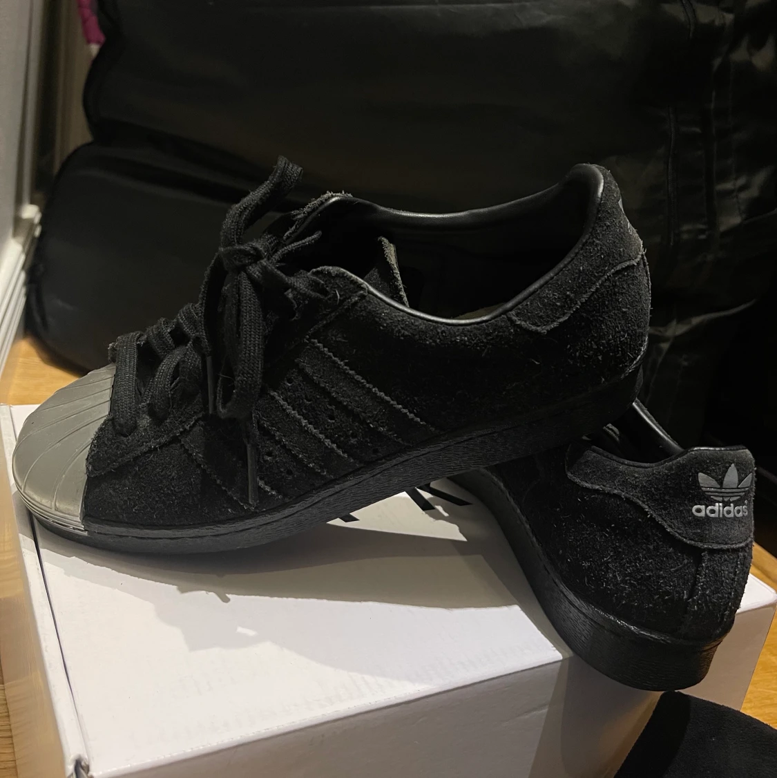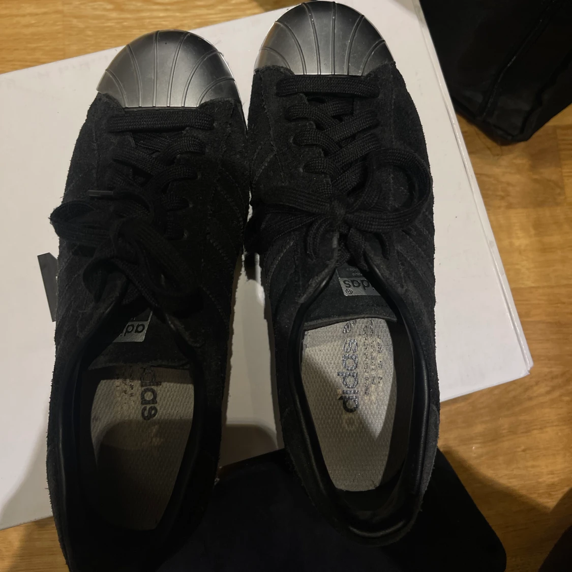 Skorna är i okej skick, de är lite slitna har blivit lite ljusare i färgen men har inga större eller synliga skador. Mocka liknande material.